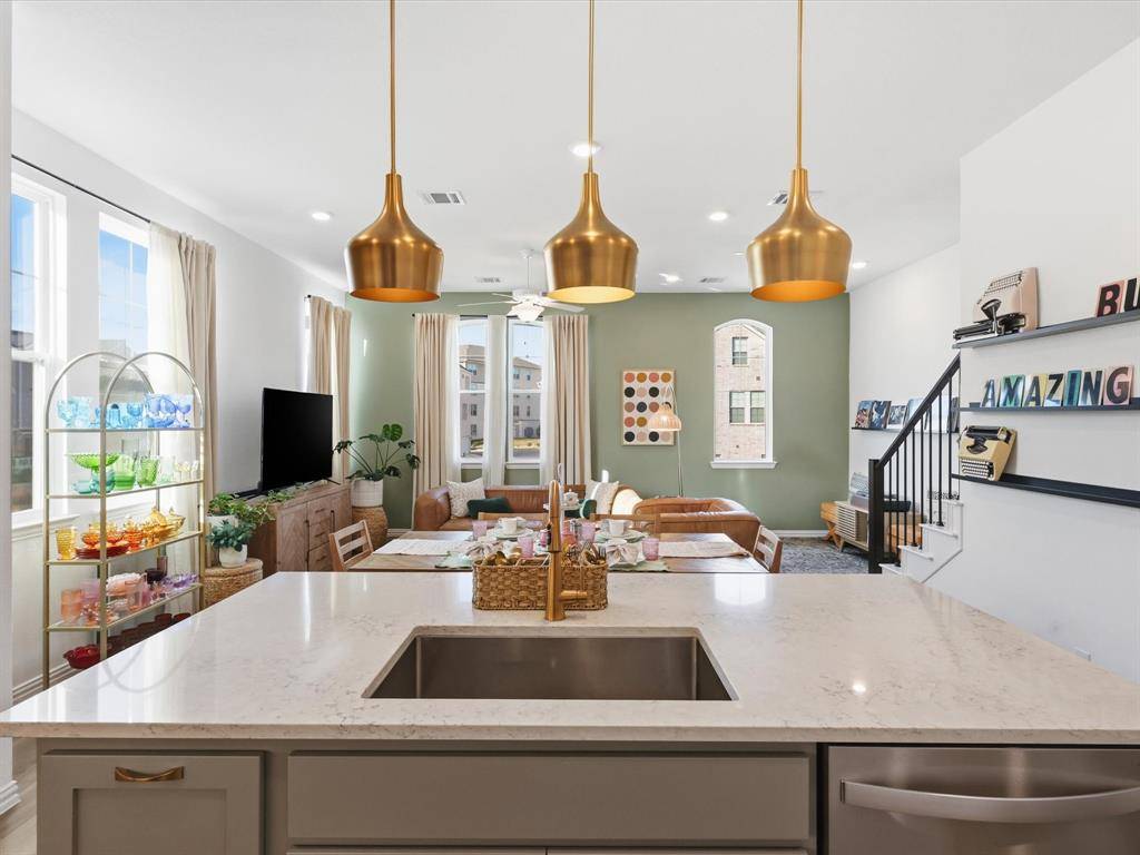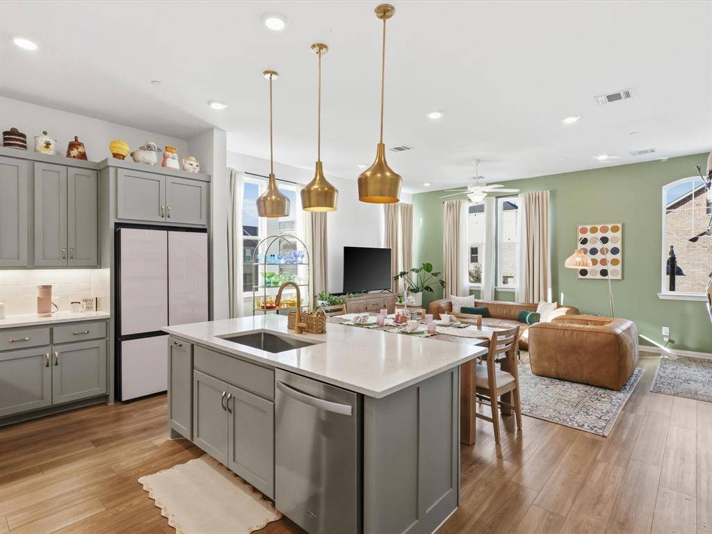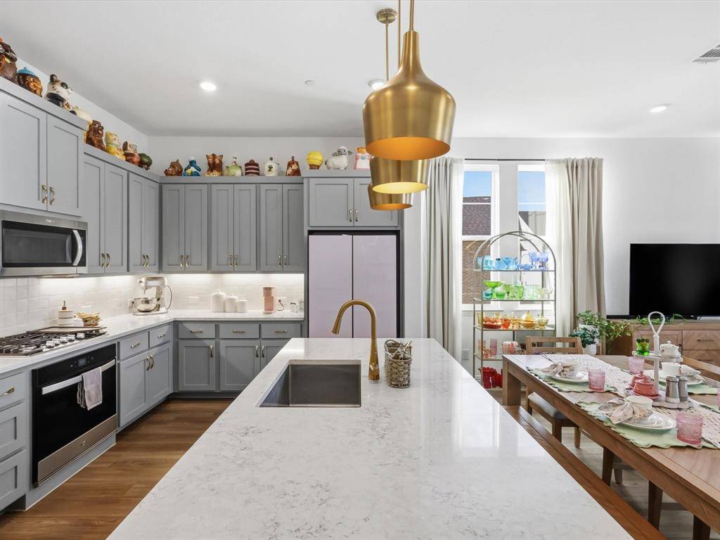 The open-concept main living area showcases luxury vinyl flooring and a gourmet kitchen with quartz countertops, eat-in island, 42-inch shaker cabinets, champagne gold hardware, walk-in pantry, and Energy Star stainless steel appliances.
