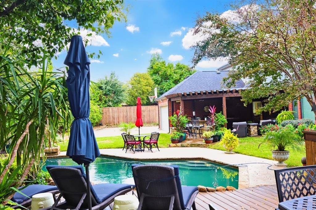 Beautiful two-story home nestled on a quiet cul-de-sac in Bedford, just minutes from popular restaurants, shopping, and everyday conveniences. Situated on an expansive lot of over half an acre, this property offers privacy, space, and exceptional indoor-outdoor living. The thoughtfully designed floor plan features three spacious living areas, ideal for both sophisticated entertaining and comfortable daily living. Natural light flows throughout the home, enhancing the warm and inviting atmosphere. Designed with a multi-generational suite that offers a blend of privacy with is own living space, full bath, and bedroom. It allows a rare blend of privacy, connection, and elevated comfort for the entire family. Step outside to your private backyard retreat, complete with an outdoor kitchen, covered patio, sparkling pool, and an elevated deck overlooking the grounds--perfect for hosting unforgettable gatherings or enjoying quiet evenings at home. This home combines a prime location with generous living spaces and resort-style amenities, offering a rare opportunity in the heart of the Dallas-Fort Worth area.