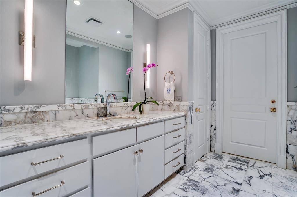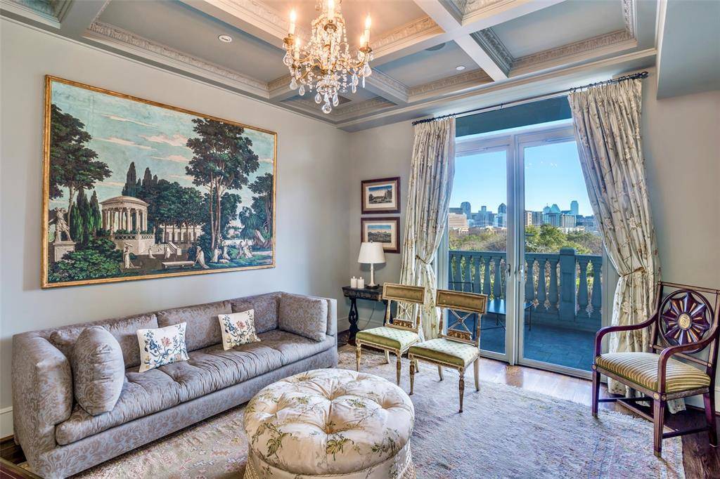 Beautifully reimagined by Lyn Muse Interiors, this extraordinary residence offers the finest in Dallas high-rise living. Stunning custom millwork, rich herringbone hardwood floors, and a dramatic marble entry with direct elevator access set the stage, complemented by floor-to-ceiling windows showcasing sweeping views of downtown Dallas and Turtle Creek Park. The formal living room features a striking natural stone fireplace.