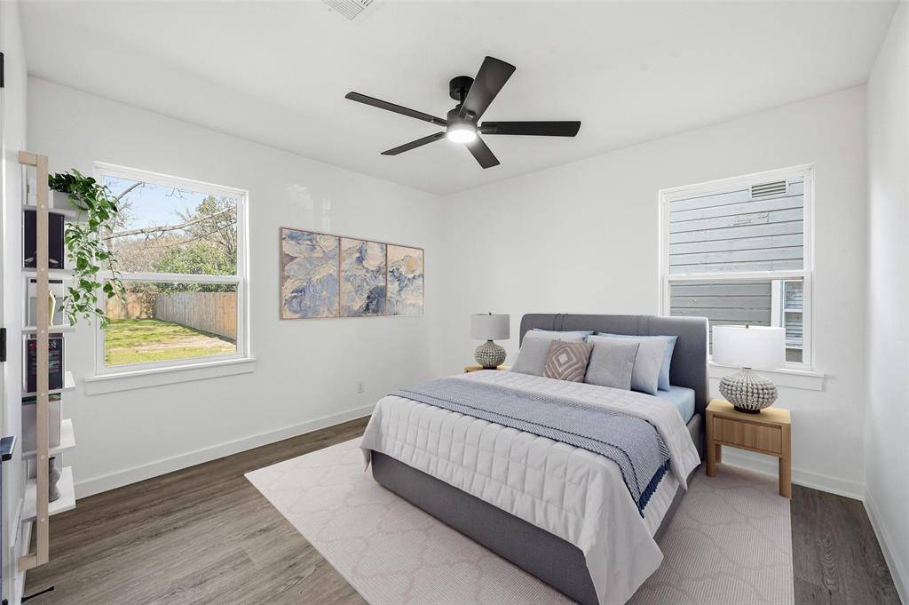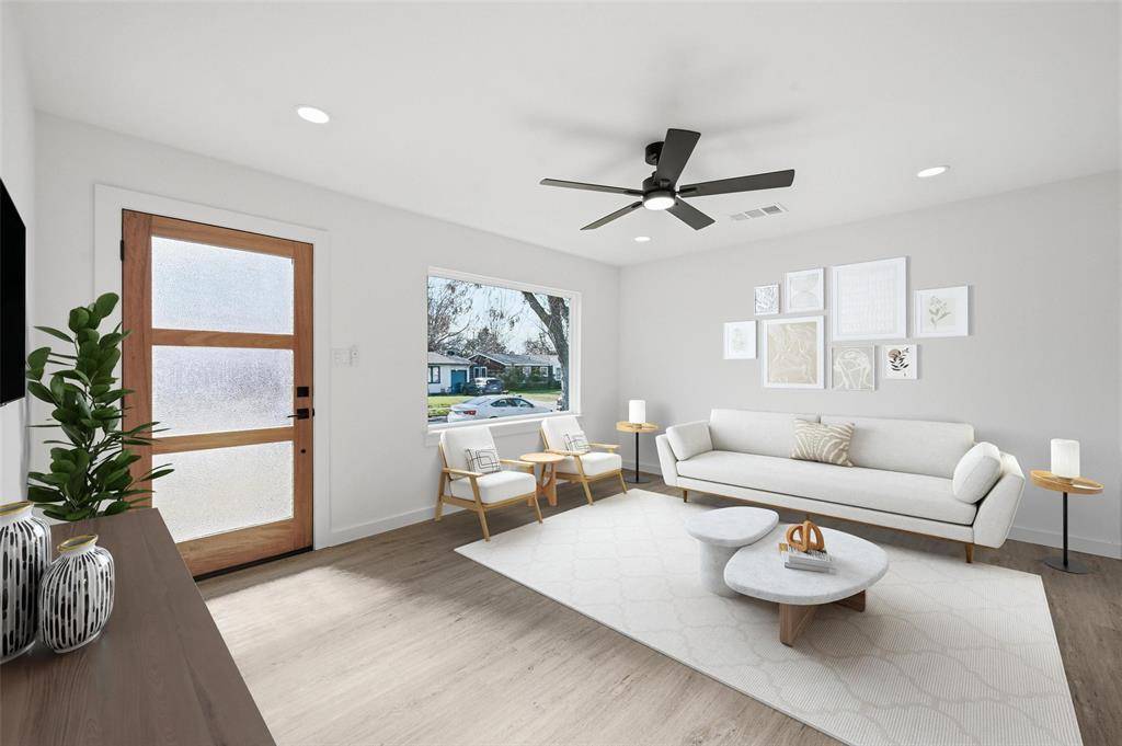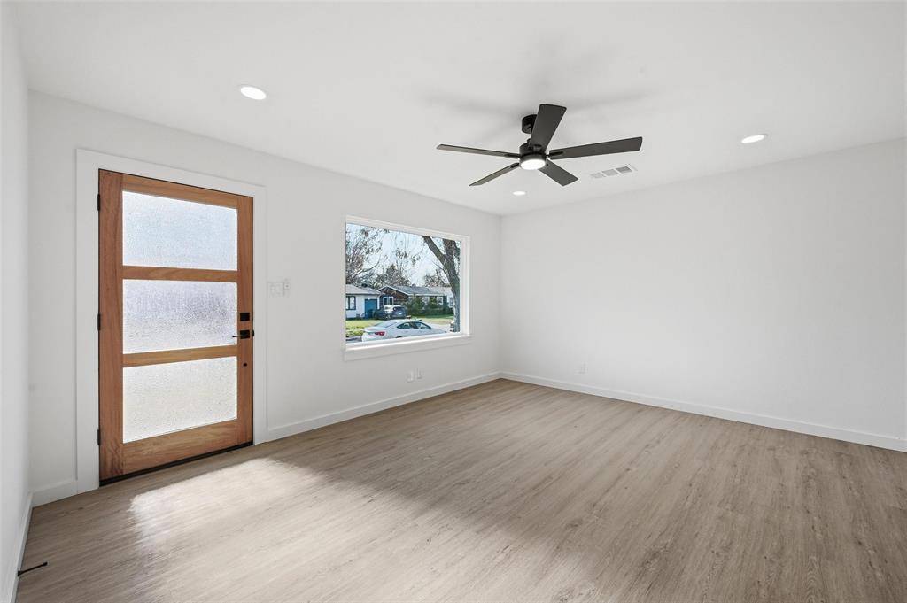 This beautifully remodeled 3-bedroom, 1-bath home truly lives like new, offering approximately $75,000 in upgrades and updates and a rare turn-key, worry-free opportunity. Thoughtfully redesigned from top to bottom, the flexible layout includes a front bedroom ideal for a home office, nursery, or workout space. A grand entry with new railings, a modern cedar front door, and a custom cedar surround entry sets the tone. Inside, a bright open floor plan is filled with natural light from brand-new Low-E windows, including oversized picture windows in the living room and primary bedroom. The stunning kitchen features floor-to-ceiling cabinetry, quartz countertops with gold and silver veining, a white tile backsplash, soft-close cabinets, a white ceramic sink, a gold extendable faucet, and brand-new stainless steel appliances, including a gas range, microwave, dishwasher, and refrigerator. A stackable washer and dryer are included. Light oak-tone luxury vinyl plank flooring flows throughout, complemented by recessed dimmable lighting, new ceiling fans with remotes, fresh paint, new baseboards, and all-new interior doors. The remodeled bathroom offers a modern tile shower surround and marble tile flooring. Major system upgrades provide peace of mind, including a brand-new HVAC system, a new electrical panel, a water heater under two years old, a replaced gas line, approximately 95% of sewer lines updated to PVC, and a roof just three years old—allowing buyers to move in with confidence. Outside, enjoy fresh exterior paint, modern trim, newly landscaped beds with timed irrigation, a large, newly fenced backyard, and a storage shed (clean!). This sizeable backyard is ideal for entertaining or future outdoor living. Let your imagination run wild with the possibilities! Centrally located in DFW and within walking distance to the new Bellaire Elementary School, this move-in-ready home is a rare find in an established neighborhood.