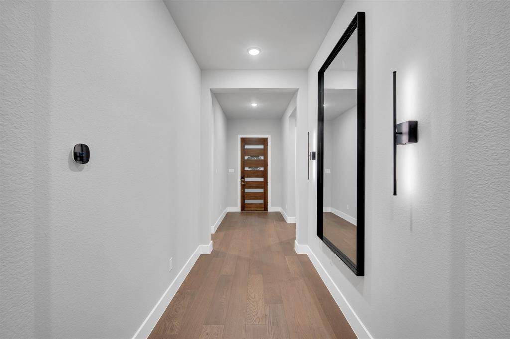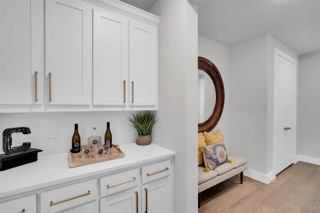 The painted brick exterior and striking 6-lite contemporary wood front door create impressive curb appeal. Inside, the open-concept layout is enhanced by warm wood flooring throughout the main living areas, ideal for both entertaining and everyday living. The gourmet kitchen features quartz countertops, premium cabinetry, a gas cooktop, and ample storage, seamlessly flowing into the living and dining spaces.