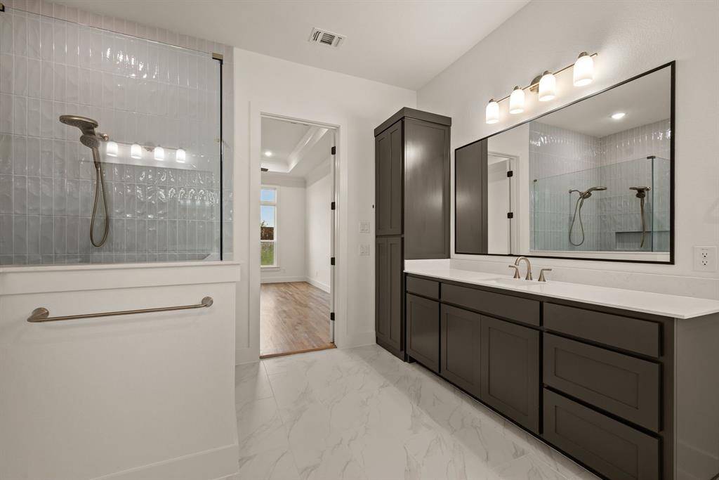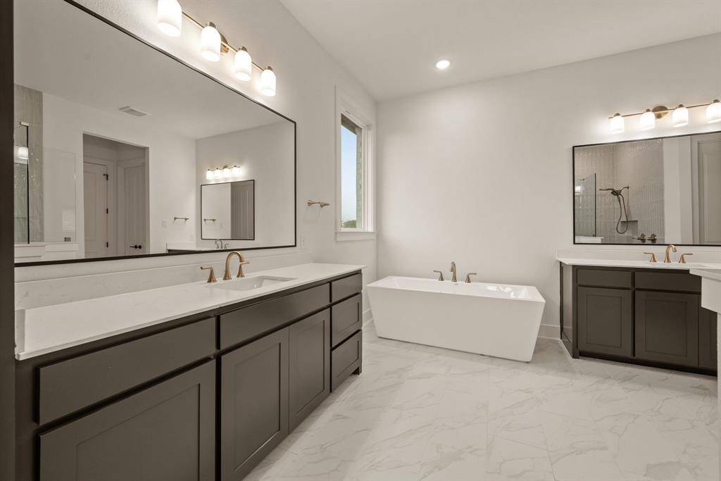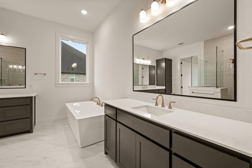 The owner's suite occupies its own private wing on the right side of the home, offering serene views of the lush backyard. The spa-inspired owner's bath features a large walk-through shower, a freestanding soaking tub, dual vanities, and a spacious walk-in closet that conveniently connects to the laundry room. Next to the owners suite, is the private owners study.