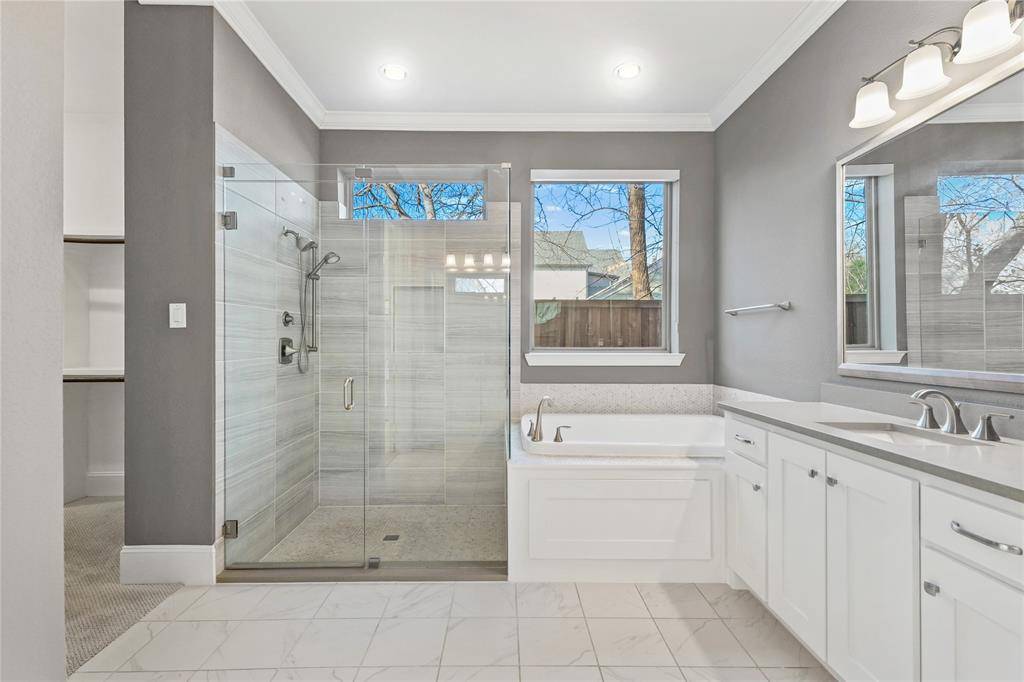 On the main level, a refined primary suite is complemented by a private guest bedroom, offering flexibility that supports both everyday living and longer-term ease. Upstairs, additional bedrooms and bonus spaces provide separation without sacrificing cohesion. A covered patio and generous yard extend the living experience outdoors, while proximity to Inwood Village, Bluffview Park, and Dallas Love Field places the home at the center of convenience and connection.