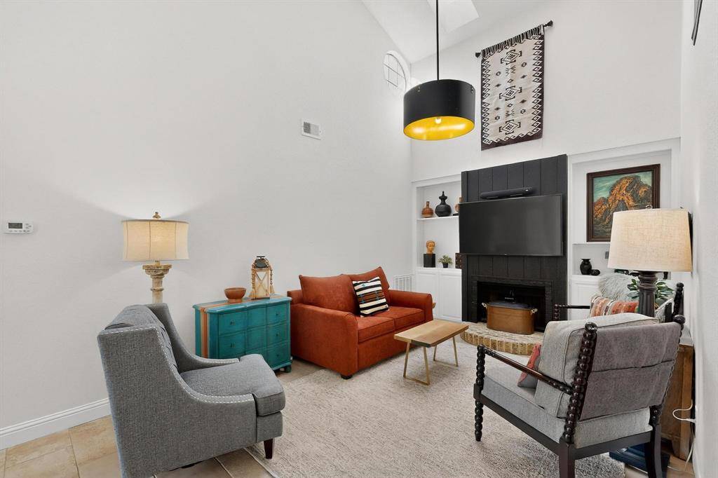 The primary suite is a true retreat with a dramatic cathedral ceiling and a spa like ensuite with a astounding black soaking tub, separate shower, dual sinks, all complemented by a quartz countertop. Every detail has been thoughtfully curated—from the custom drapes to the statement designer lighting that adds personality and elegance in every room. Cozy up by the wood-burning fireplace, beautifully framed by built-in cabinetry, or admire the stunning designer tile staircase that feels straight out of a magazine. The spacious loft offers incredible flexibility—perfect as a second living area, office, or even an additional bedroom space. The guest bedroom features a soaring cathedral ceiling and a large window that fills the space with natural light and finished with a beautiful designer light fixture. Just outside the room, a recently remodeled guest bath offers a stylish walk-in shower, quartz counters and the rich turquoise cabinet color. Enjoy the outdoors in your beautiful courtyard with a covered arbor, offering a peaceful, park-like setting ideal for relaxing or entertaining. Community amenities include a pool, and the location is unbeatable—just minutes from Bedford Boys Ranch Complex. Generous room sizes, cathedral ceilings, and designer upgrades throughout—this home is truly one-of-a-kind.