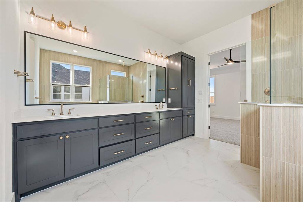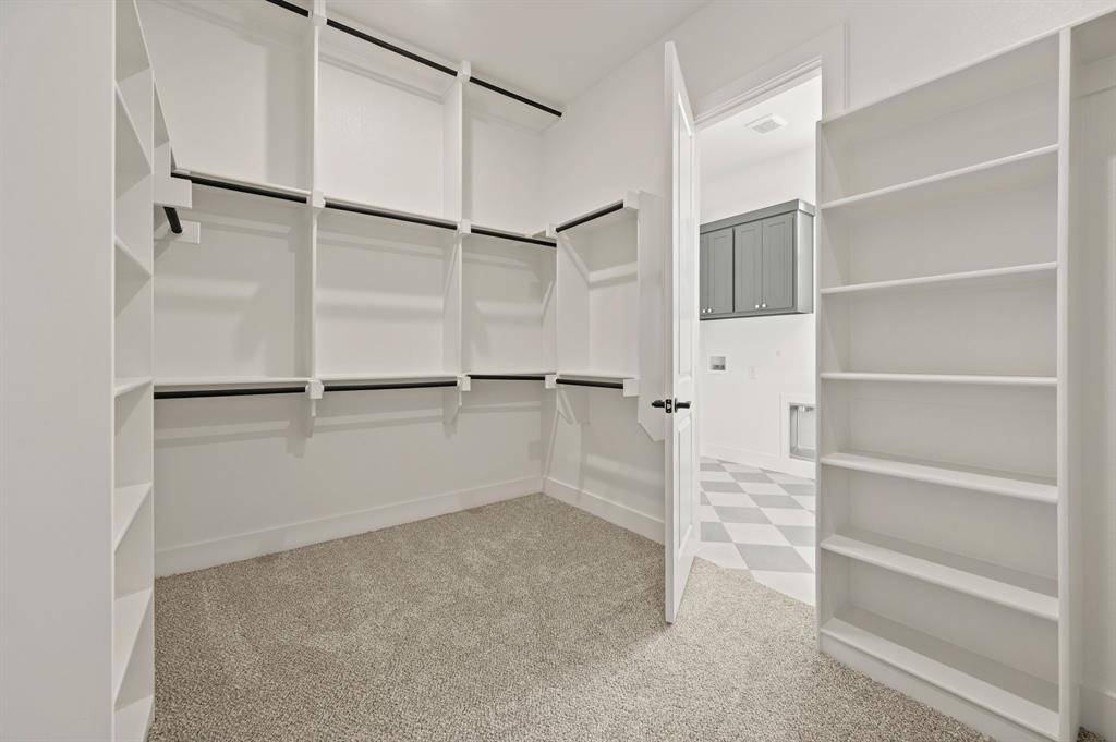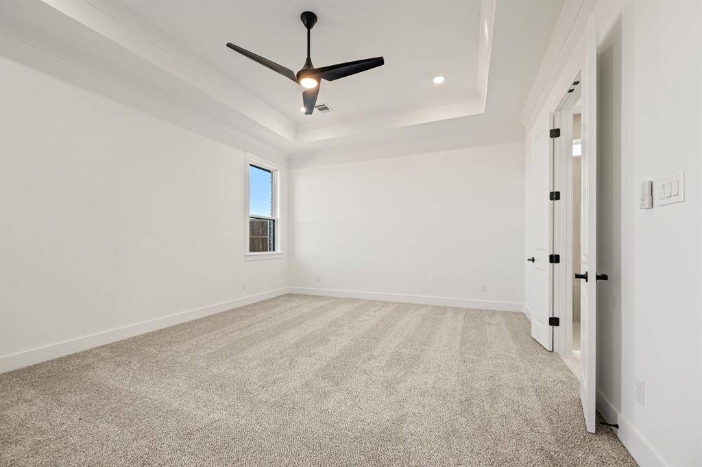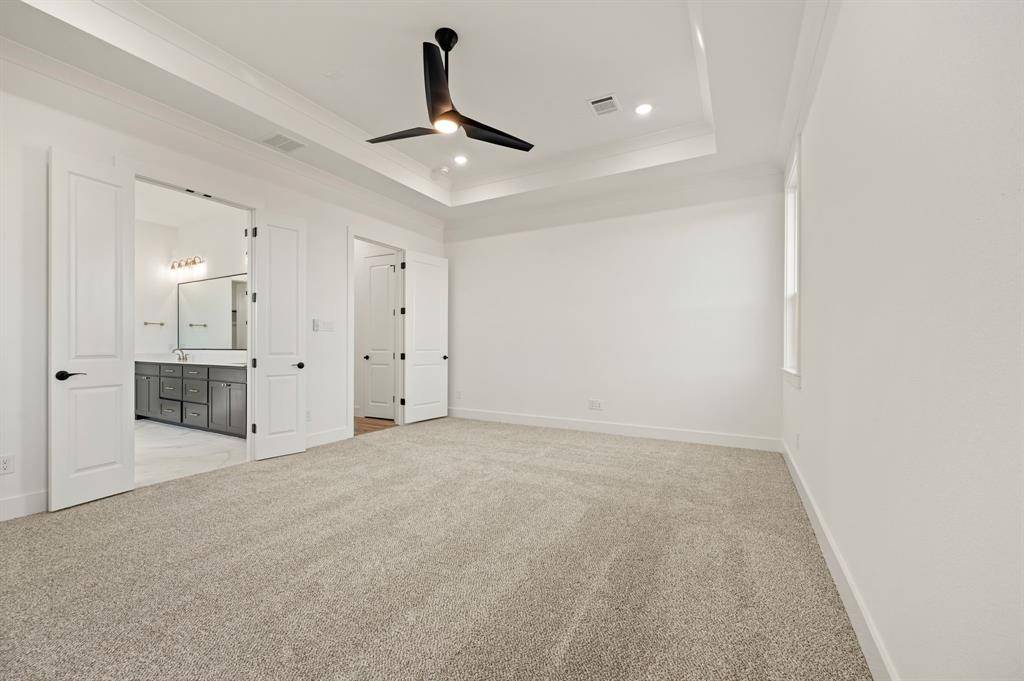 The owner's suite occupies its own private wing on the right side of the home, offering serene views of the lush backyard. The spa-inspired owner's bath features a large walk-in shower, a freestanding soaking tub, dual vanities, and a spacious walk-in closet shared bath.