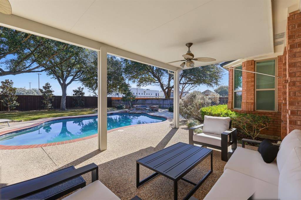 Welcome to 5809 N Ballantrae Drive in the prestigious Highland Meadows community, where elegance meets everyday comfort. Step inside and you're greeted by soaring ceilings, rich hardwood floors, fresh neutral paint, and natural light. The thoughtfully designed single-story layout offers an open floorplan. The kitchen has granite countertops, an island and flows seamlessly into the family room with an idyllic wood-burning fireplace. Separate formal dining room has wainscoting and is perfect for everyday or holiday meals. The dedicated office or secondary living space is ideal for working from home or relaxing with family. The spacious primary suite is a true retreat, complete with a sitting area for reading and a spa-inspired bath featuring a classic claw-foot soaking tub, an oversized walk-in shower and closet. Two secondary bedrooms share a Jack-and-Jill bath, while an additional bedroom with its own en suite bath provides an ideal space for guests or multi-generational living. Outside, the home is just as impressive. Situated on a lush corner lot with a gated driveway and three-car garage, it offers exceptional curb appeal. The backyard is designed for entertaining and unwinding alike; featuring a sparkling pool and spa, mature landscaping, and a covered patio perfect for grilling, gathering, and hosting pool parties on warm Texas evenings. With solar panels and a well for landscaping water, you'll enjoy impressive energy efficiency and utility bills that are much lower than your neighbors. Located in the highly acclaimed Grapevine-Colleyville Independent School District, minutes from major highways and Dallas-Fort Worth International Airport, and just a short drive to premier shopping and dining at Southlake Town Square, Historic Downtown Grapevine and Grapevine Lake for hiking and biking. This home offers not just luxury, but an exceptional lifestyle. Come experience the best of Ballantrae and make this remarkable home your own.