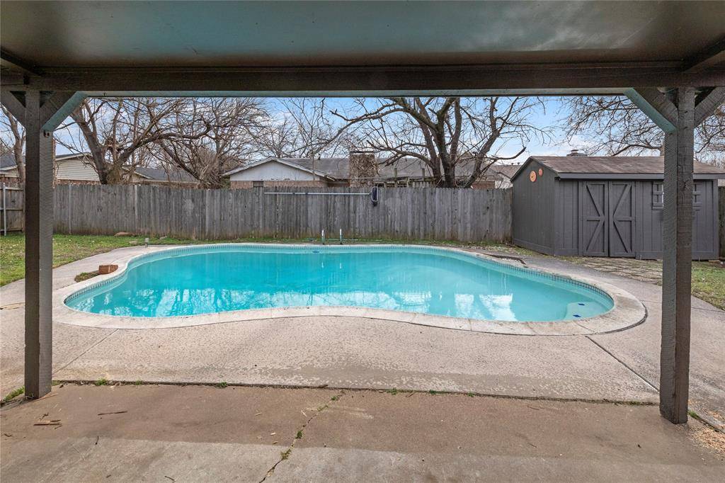 Step outside to your private backyard featuring an in-ground pool—perfect for enjoying warm Texas summers. A covered patio offers shaded seating for gatherings, while the large grass area provides space for pets and play. A storage shed and full fencing add convenience and privacy.