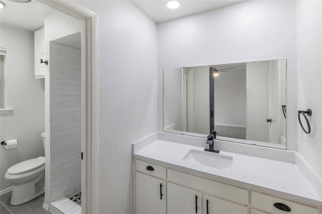The primary suite offers a spacious retreat with plush carpeting and an updated ensuite bath complete with a sleek vanity, contemporary fixtures, and a uniquely tiled walk-in shower with decorative accents. Secondary bedrooms provide ample space and flexibility for family, guests, or a home office. Secondary bathroom provides an extended vanity, contemporary fixtures, and a tub-shower combination accented by marble-look tile surround.