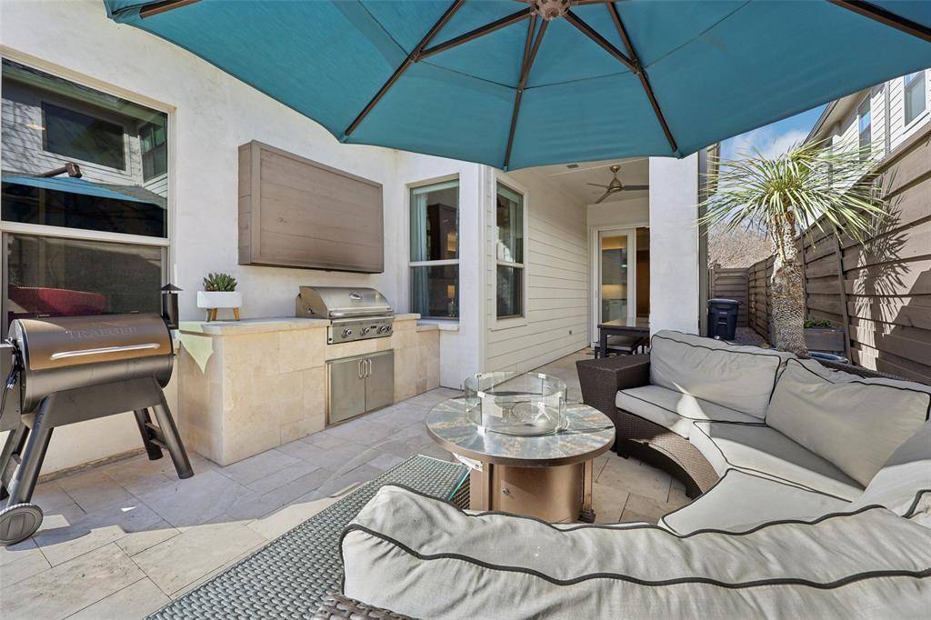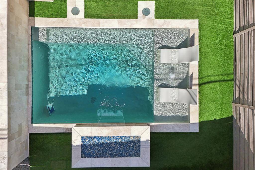 In the back is a private backyard resort, a rare gem in the neighborhood. Dive into the sparkling pool with cascading waterfall, surrounded by lush landscaping, stone accents, and multiple lounging spots. The covered patio boasts a built-in grill, ceiling fans, and ambient lighting for year-round al fresco dining and relaxation. Thoughtful design delivers privacy and tranquility, ideal for barbecues, poolside evenings, or unwinding.