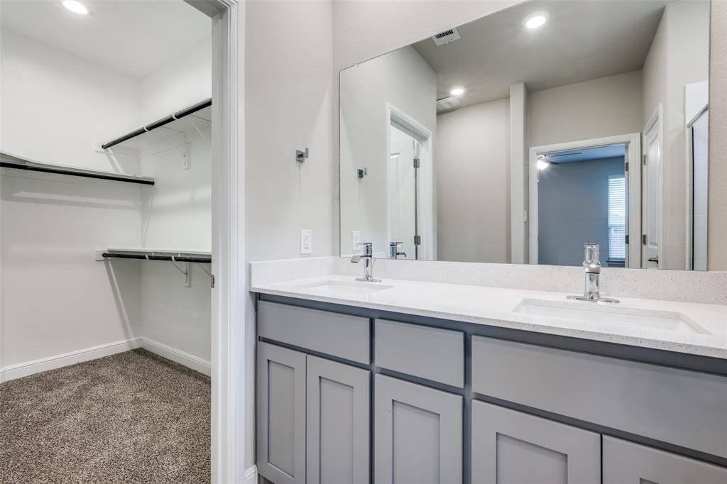 The luxurious primary suite offers a relaxing retreat with dual sinks, a quartz vanity, step-in shower with seating, and a large walk-in closet with built-ins.