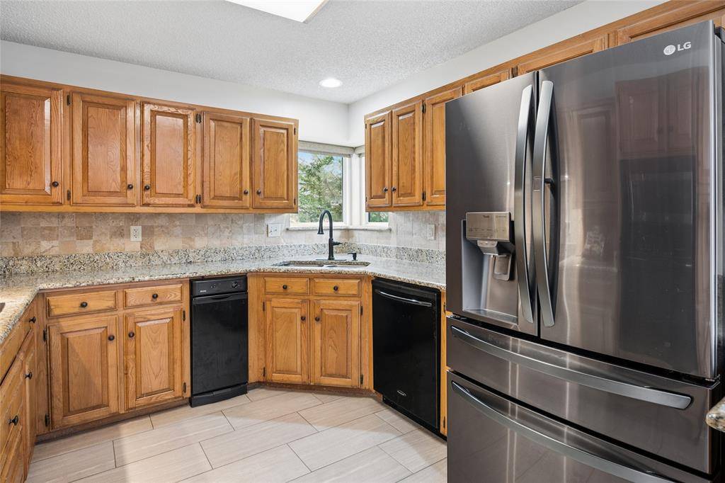The kitchen boasts ample counter space and storage, making it an ideal setting for meal preparation. A wet bar is conveniently located between the kitchen and the dining room. Abundant natural light enhances the warm and inviting atmosphere throughout the home.