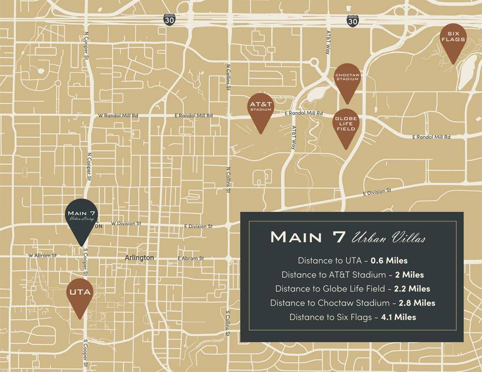 MODEL HOME – MOVE-IN READY! Perfectly situated between Dallas, Fort Worth, and DFW Airport, Main 7 Luxury Villas offer the ideal balance of location, lifestyle, and luxury. These new-construction townhomes are thoughtfully designed with high-end finishes, including Italian Bertazzoni appliances, white oak engineered hardwood floors, marble backsplashes, quartz countertops, Delta plumbing fixtures, and designer lighting throughout. Peace of mind comes with the fully fenced and gated community as well as your own private garage. Inside, the spacious primary suite features a dual-sink vanity, oversized walk-in shower, and custom cabinetry. The guest suite is equally impressive, complete with a large closet and ensuite bath—perfect for visitors or long-term stays. Need a dedicated workspace? Each floor plan includes a private office with French doors, making it easy to work or study from home in style. Location is everything, and Main 7 delivers. Within walking distance to The University of Texas at Arlington and minutes from top dining, entertainment, and shopping, you'll have easy access to all the best the Metroplex has to offer. Catch a Rangers or Cowboys game at AT&T Stadium or Globe Life Field, enjoy dinner at Babe's, or sip cocktails at Texas Live—all just minutes from your doorstep. With only a limited number of homes available, now is the perfect time to secure your place at Main 7 and experience the lifestyle you've been waiting for!