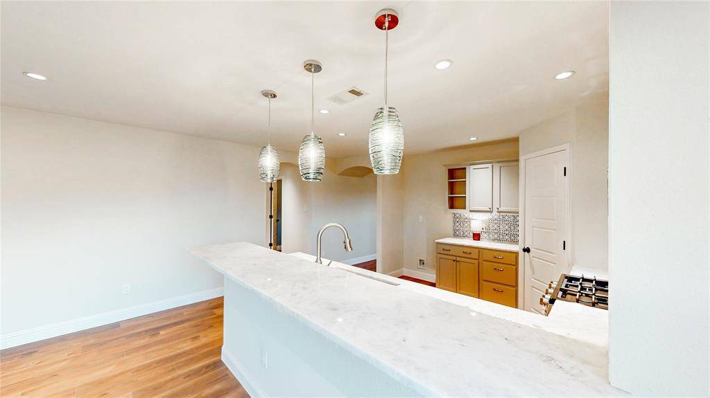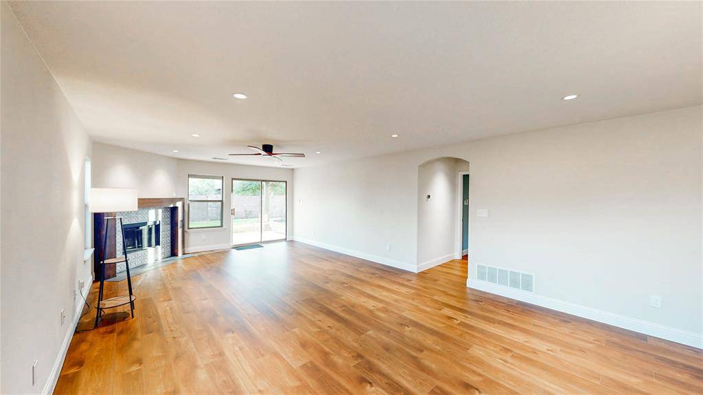 Beautifully remodeled one-story home on a corner lot in a fantastic location! Fresh front landscaping and newly painted exterior create standout curb appeal the moment you arrive. Inside, the home has been updated from top to bottom with modern finishes and thoughtful improvements throughout. New luxury vinyl plank flooring runs throughout the entire home, creating a cohesive, stylish look that is both durable and low maintenance. As you enter, you are welcomed by a front dining room that can easily serve as a flexible space for a second living area, home office, or playroom depending on your needs. The updated kitchen is a standout feature, offering quartz countertops, a stylish blue tile backsplash, stainless steel appliances, and freshly painted cabinetry for a bright, modern feel. The open-concept layout flows effortlessly into the spacious living room, where a statement fireplace with coordinating tile and an updated wood mantle creates a beautiful focal point. The living area connects seamlessly to the breakfast area and kitchen, making the home ideal for both everyday living and entertaining. Additional updates include recessed lighting and updated light fixtures throughout, along with new mirrors, faucets, doors, and refreshed finishes that elevate every space. Nearly every surface inside and out has been thoughtfully improved, giving this home a clean, contemporary feel. Move-in ready and beautifully updated, this home is a must see!
