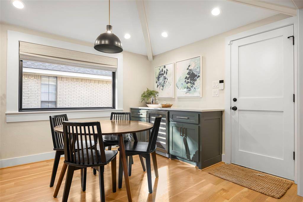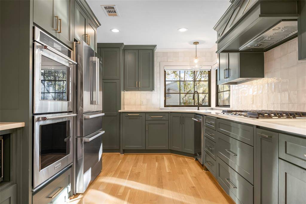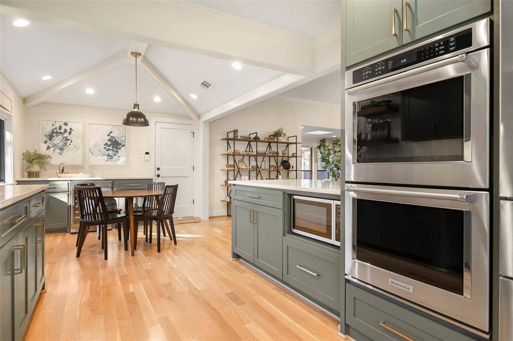 Inside, white oak hardwood floors with a herringbone detail in the entry set the tone. Soaring ceilings and a wood-burning fireplace anchor an inviting living room. The kitchen is equipped with a full KitchenAid appliance package — 36 inch gas cooktop, double ovens, and a french door refrigerator with dual freezer drawers — plus a wine fridge. Standout finishes include black Andersen windows with divided lites, new custom cabinetry throughout, and designer wallpaper in the dining room.