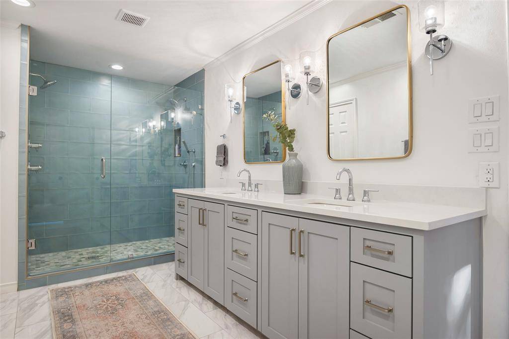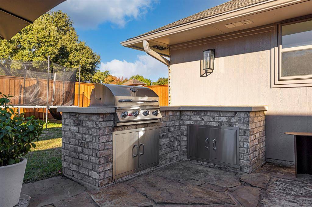 Out back, a large yard with plenty of room for a pool is ready for entertaining with a built-in grill area and sliding electronic gate.