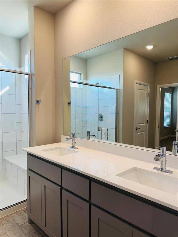 The primary suite includes a dual-sink quartz vanity, an oversized shower with a built-in seat, a linen closet, and a walk-in closet with built-ins. The secondary bathroom also features a quartz vanity.
