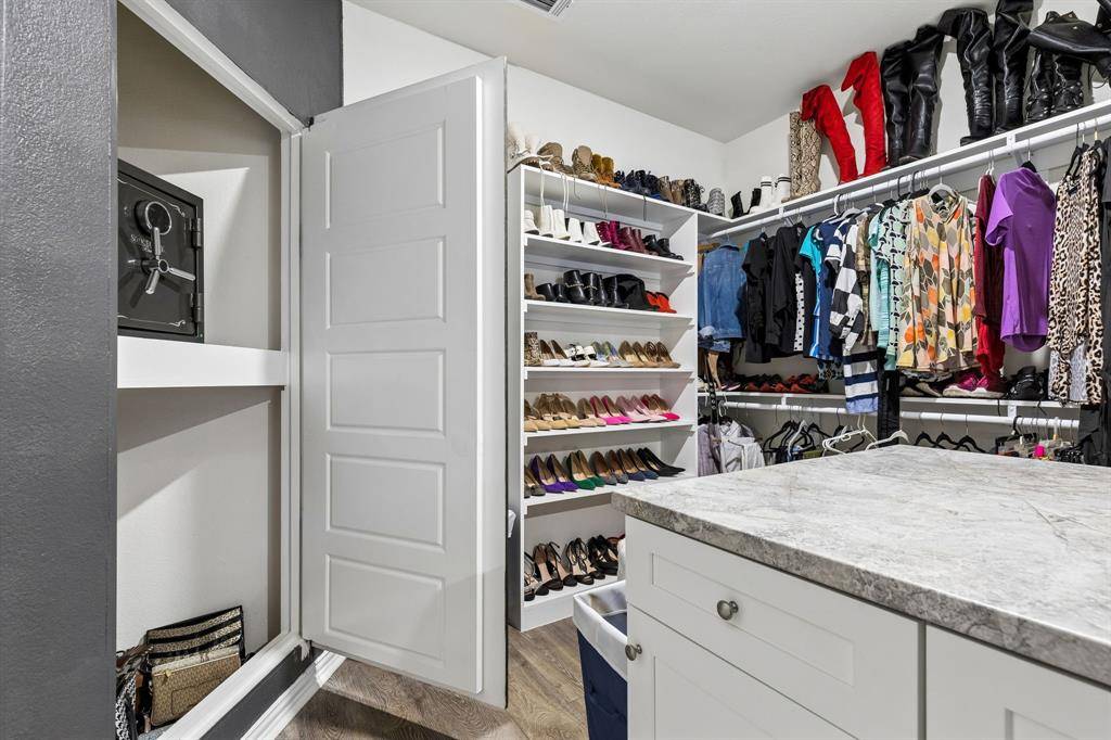 The main living level features a light-filled open-concept layout with luxury vinyl plank flooring, recessed lighting, and a sleek decorative fireplace, flowing seamlessly into the dining area and chef-inspired kitchen complete with quartz countertops, a large island, stainless steel appliances, and walk-in pantry. Upstairs, the spacious primary suite offers a well-appointed ensuite with dual sinks, a walk-in shower with bench, and an expansive custom closet featuring a center island and discreet built-in privacy storage. A secondary bedroom with its own full bath provides added flexibility for guests or everyday living.