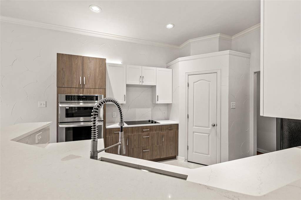 The spacious family room is the heart of the home, featuring a cozy wood-burning fireplace, recessed lighting, and expansive windows that fill the space with natural light. It flows seamlessly into the renovated kitchen, where updated cabinetry, quartz countertops and backsplash, stainless steel appliances and sink, new tile flooring, and a two-tier breakfast bar create the perfect setting for everyday living and entertaining.