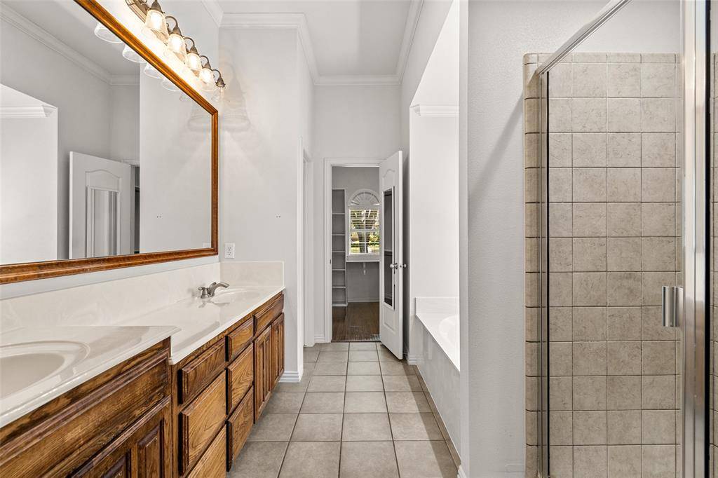 The private primary suite is a true retreat, complete with dual sinks, a relaxing garden tub, separate walk-in shower, and a generous walk-in closet. Secondary bedrooms are well-sized, each offering laminate flooring and walk-in closets — ideal for family, guests, or a home office.
