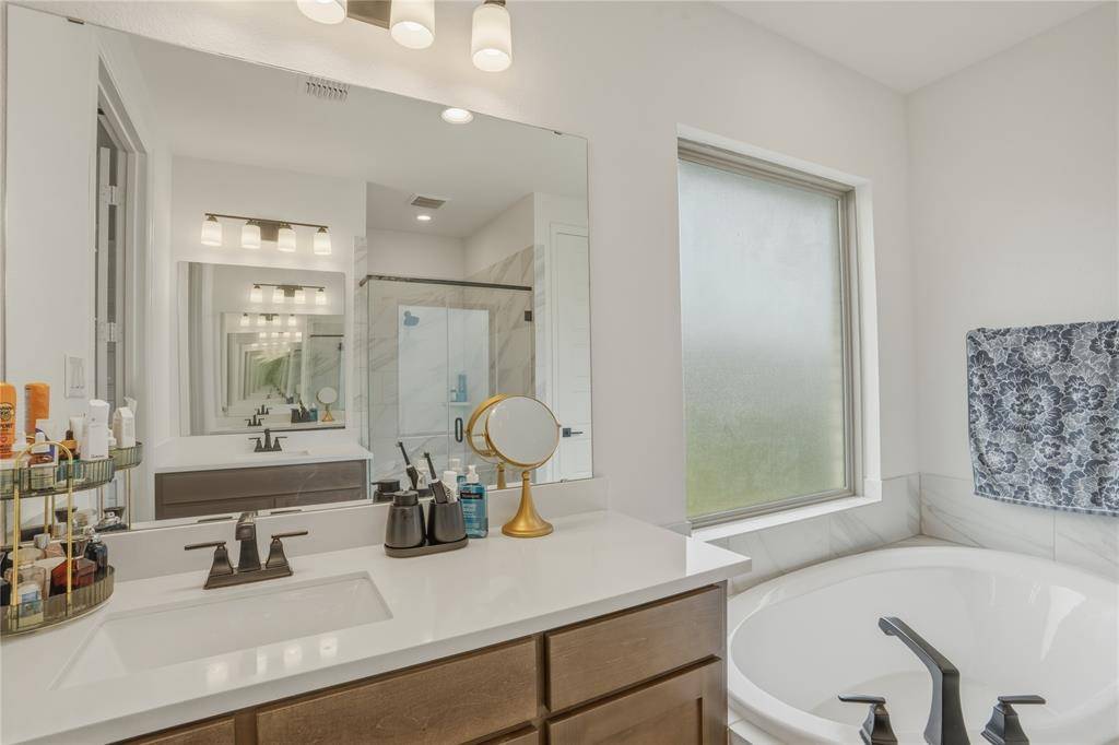 The primary suite offers a private retreat with a spa-like bathroom featuring dual vanities, a soaking tub, separate glass-enclosed shower, and large walk-in closet. Secondary bedrooms are generously sized with ample storage.