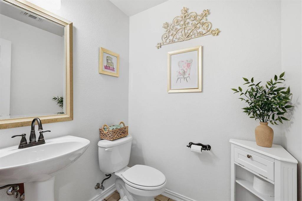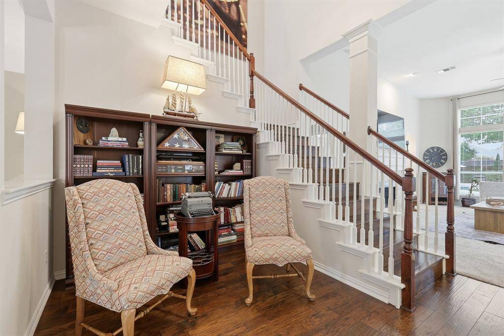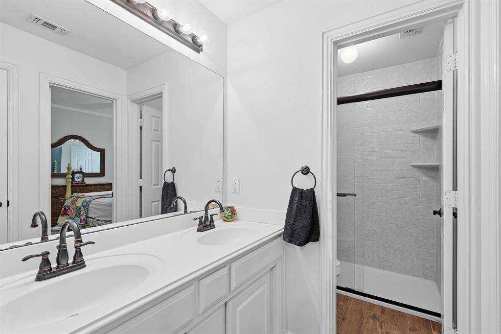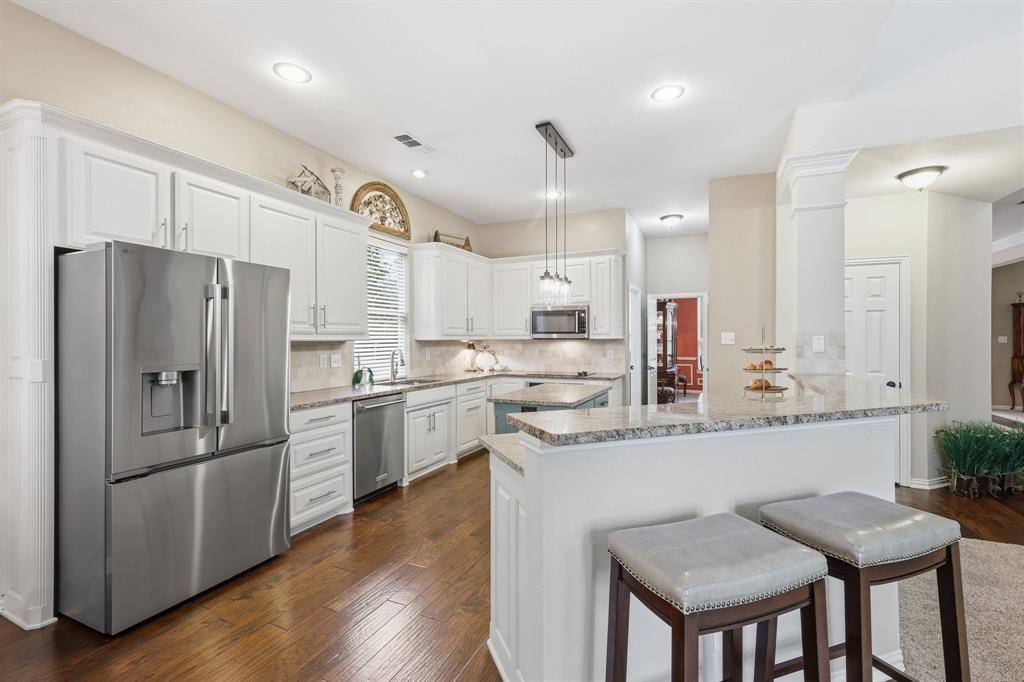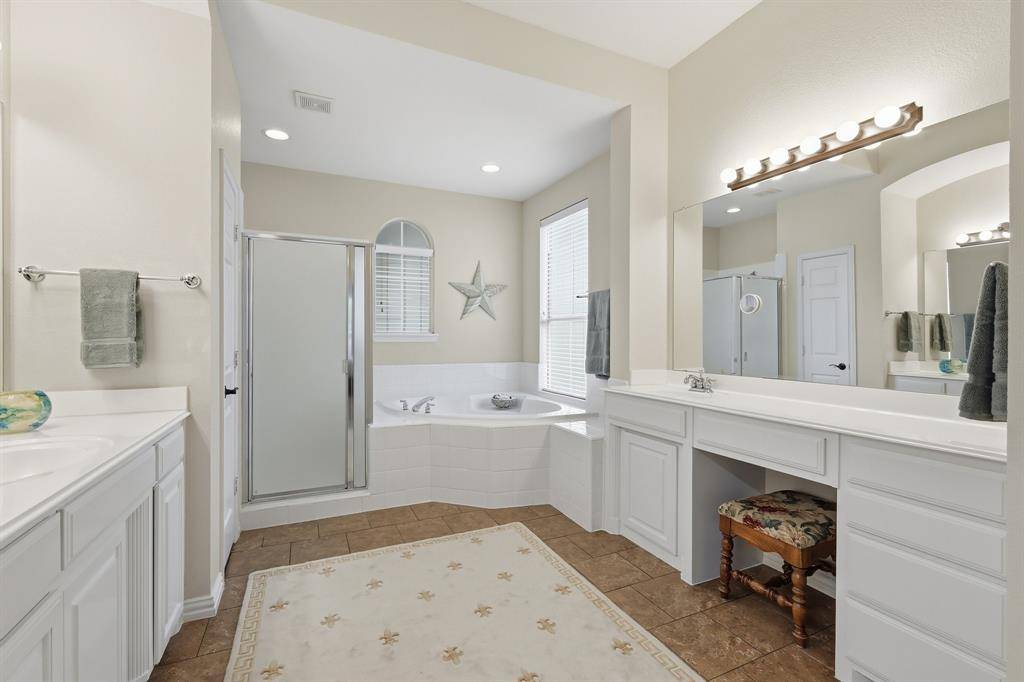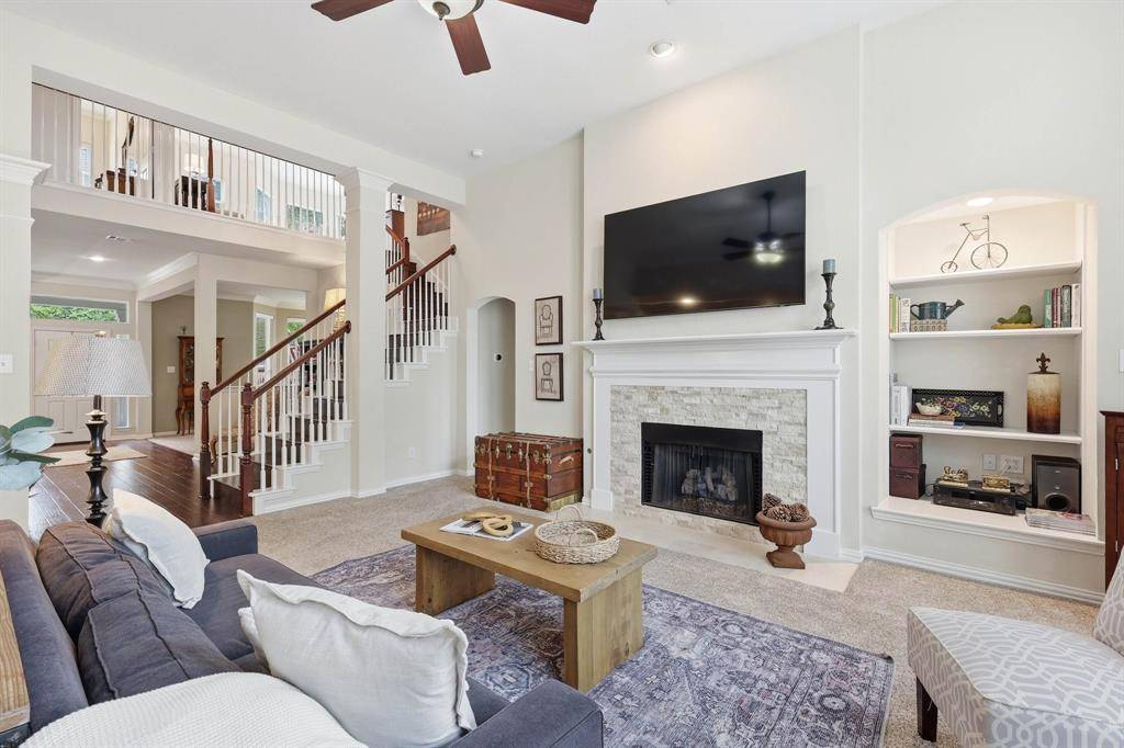 Inviting 4 bedroom, 3.5 bath home in the highly sought-after HomeTown community, set on an oversized lot - an uncommon find for the neighborhood - with a welcoming wrap-around front porch. The sellers have kept up with the maintenance of this home, recently replacing water heaters and HVAC, and painting the exterior in 2025. The floor plan offers both formal and everyday living spaces, along with a charming bonus room with a picturesque nook that is perfect for a game table or reading corner. The living room features a vaulted ceiling and a wall of windows, filling the home with natural light. An updated gas fireplace with tile surround makes the room extra cozy on chilly days. The large kitchen, with updated appliances, provides plenty of space for everyday living and entertaining. The downstairs master suite includes a spacious primary bath with separate vanities, a soaking tub, and plenty of space to get ready, as well as a huge closet with extra storage space under the stairs. Upstairs, there are three additional amply-sized bedrooms and two full bathrooms, plus the flexible bonus room. Upstairs carpet was just replaced in March 2026. The backyard is designed for enjoying Texas weather, complete with a Claffey pool and generous yard space. A long driveway with an electric gate adds convenience and privacy. Located just a few doors down from a neighborhood park, with more green spaces, walking trails, fishing dock, playground and schools all within walking distance. You will love the ease of living in this one-of-a-kind neighborhood. This lifestyle is hard to find anywhere else!