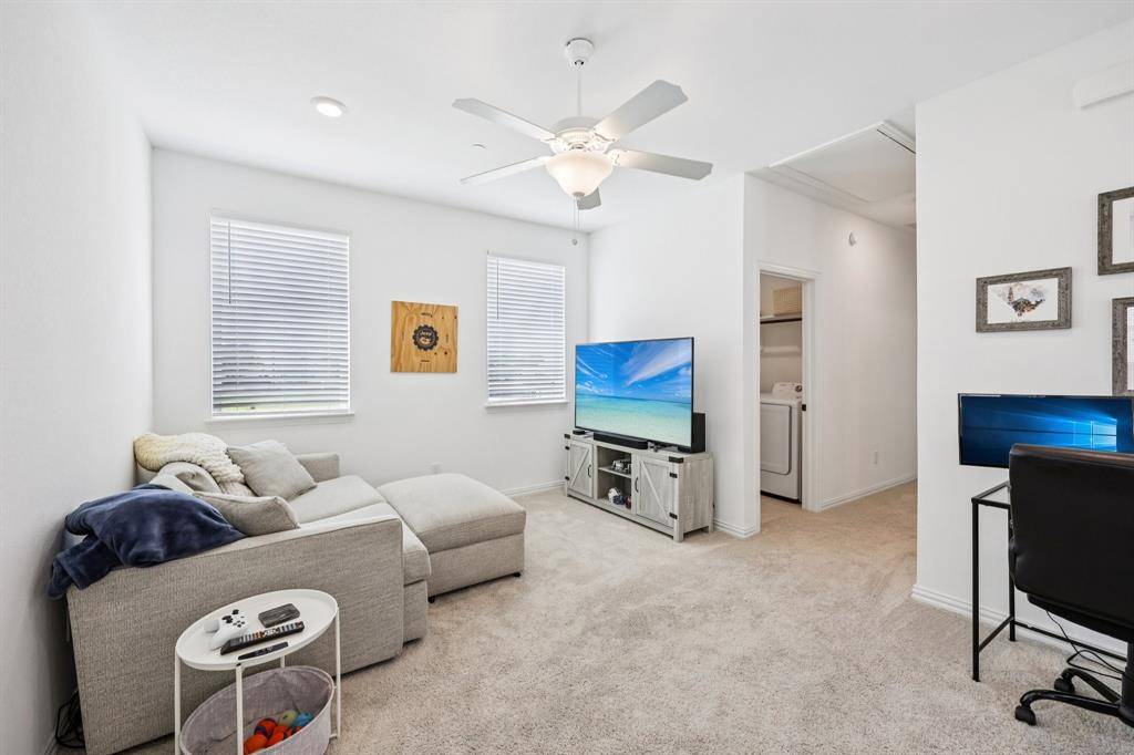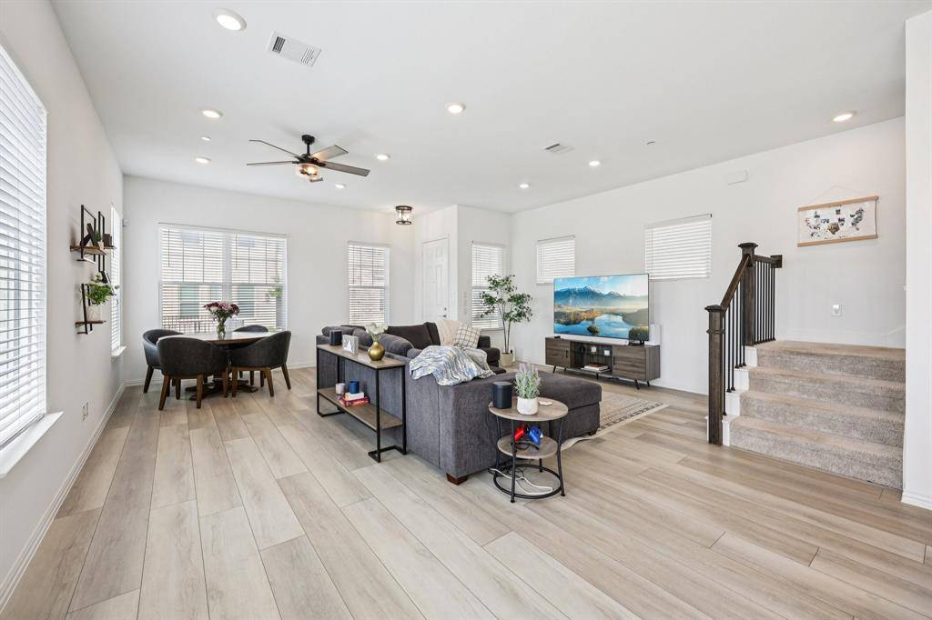 At 2,062 square feet, this light-filled two-story home delivers a true open-concept layout on the main floor which flows seamlessly from the kitchen through the dining and living areas. The kitchen is a standout: stainless steel appliances, gas cooktop, upgraded countertops, designer backsplash, and an oversized island that anchors the space. Upstairs, a large flex room gives you the freedom to create a second living area, dedicated home office, game room, or fitness studio — a rare feature at this price point. Three spacious bedrooms, two full bathrooms, and a half bath round out the floor plan. The HOA maintains the front lawn and landscaping outside of the fence. A 2-car garage adds everyday convenience, and the refrigerator, washer, and dryer are available to convey with an acceptable offer — move-in ready from day one.