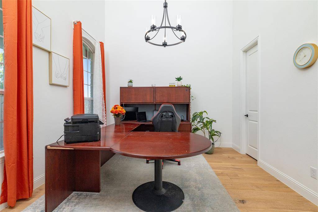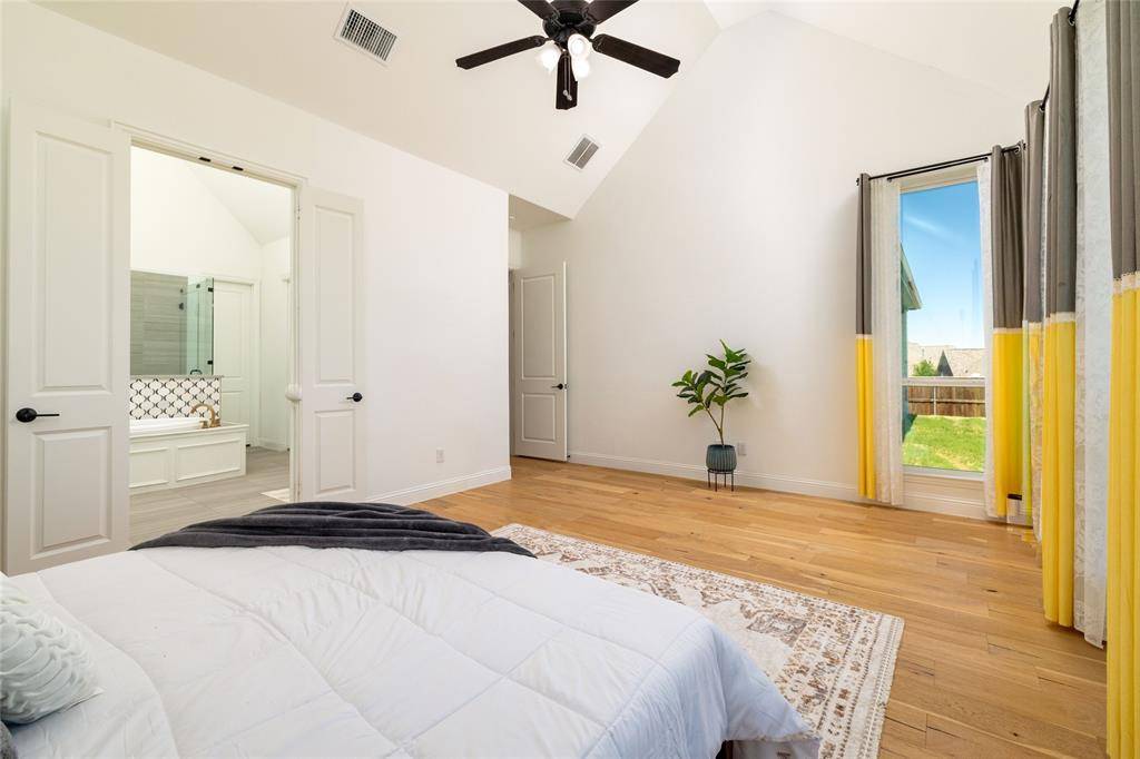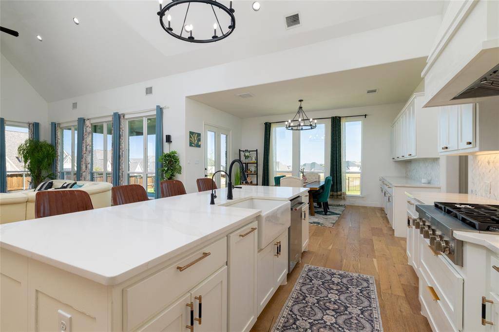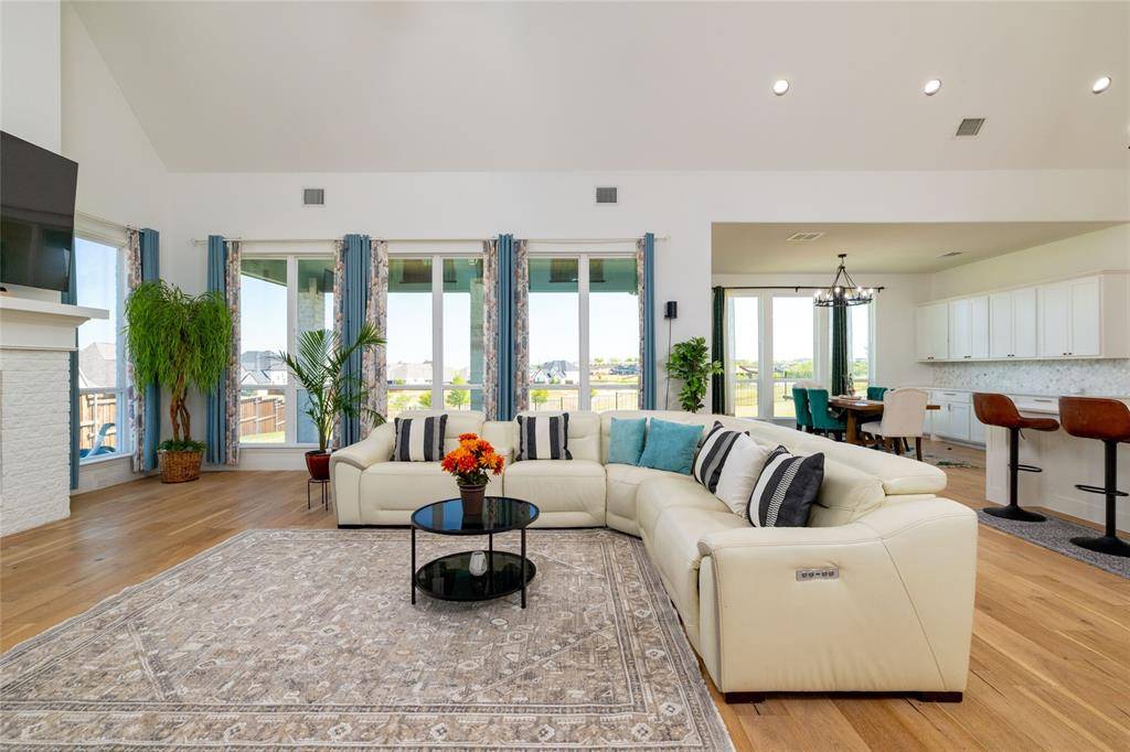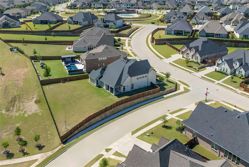 Lovely transitional-style luxury home in the highly desirable Watercress community, situated on a premium 0.41-acre corner lot with serene pond views. Offering approximately 4,875 sq ft, this 5-bedroom, 5.5-bath, 3-car garage residence blends modern elegance, functional design, and upscale finishes.The open-concept floor plan features vaulted ceilings, expansive windows, and abundant natural light, complemented by wide-plank white oak flooring throughout the main living areas. The chef's kitchen is equipped with KitchenAid appliances, a large island, butler's pantry, and designer lighting, seamlessly connecting to the spacious living and dining areas—ideal for entertaining and everyday living. The primary suite on the main level offers a spa-inspired bath with soaking tub, oversized walk-in shower, and dual walk-in closets. All secondary bedrooms include ensuite baths, providing privacy and comfort for family and guests. Additional features include a dedicated media room, game room, bonus living area, and oversized utility room, offering flexibility for work, play, and relaxation. Exterior highlights include the corner lot positioning, tranquil water views, and expansive outdoor space with room to customize or build a backyard oasis. A rare opportunity to own a luxury home with space, views, and premium upgrades in a prime Haslet location.