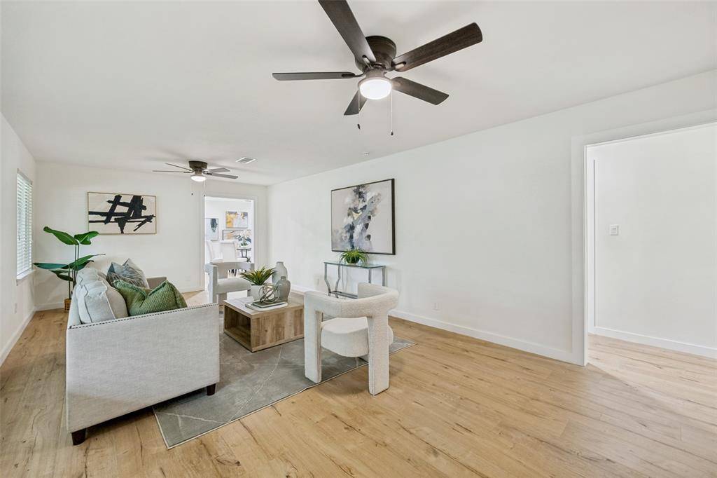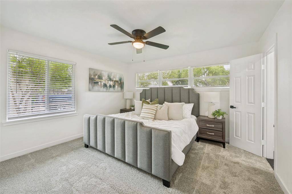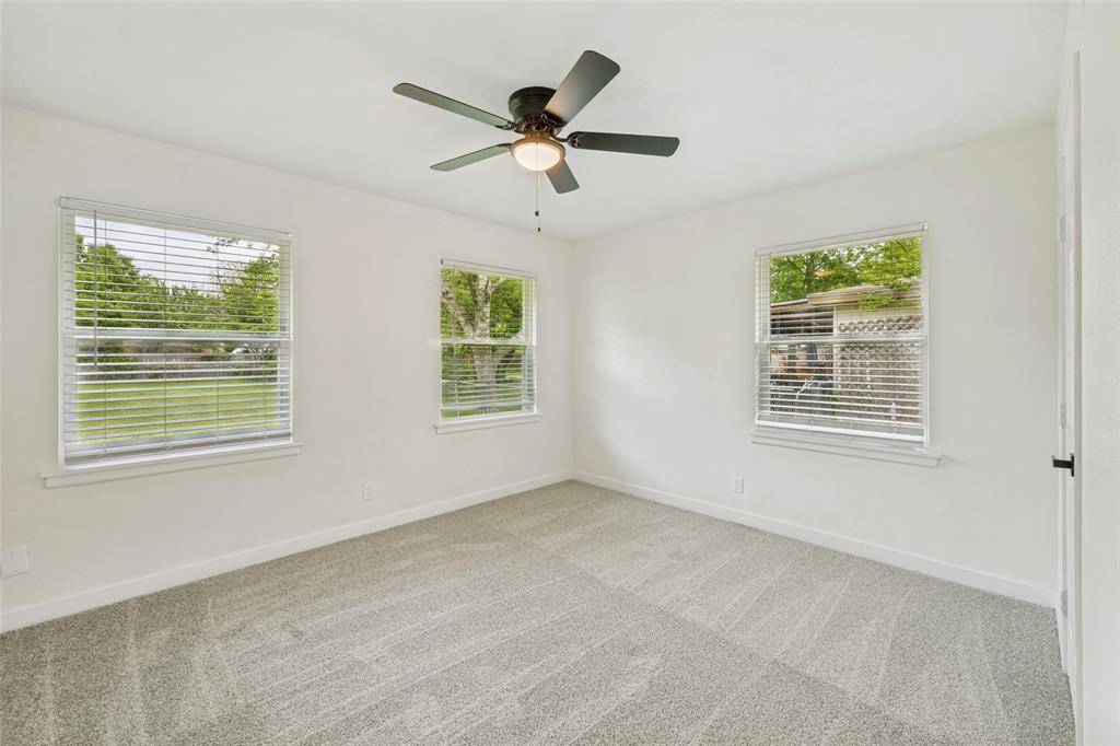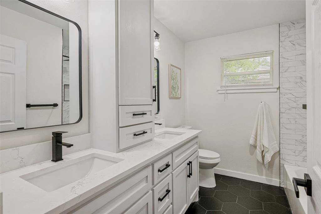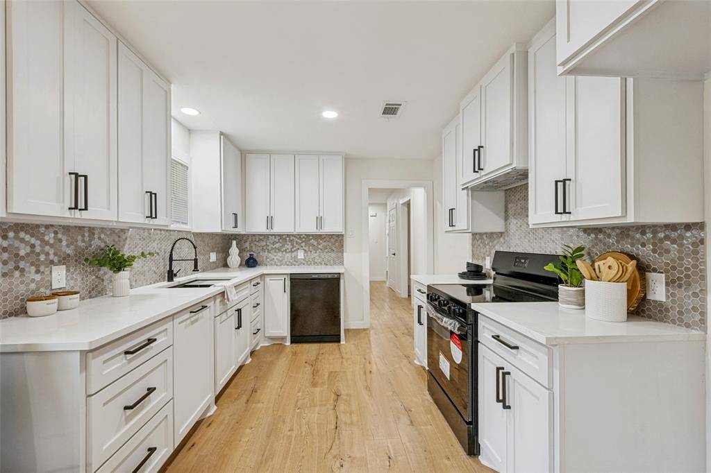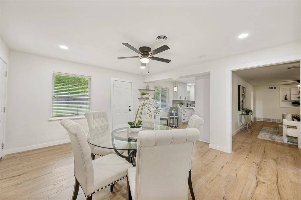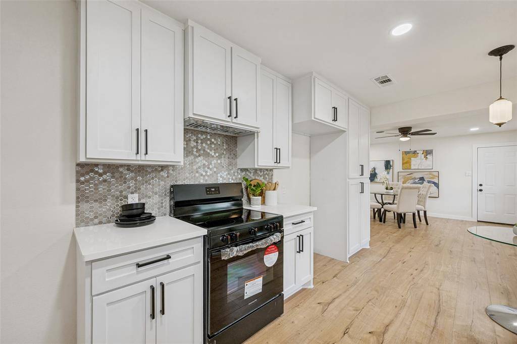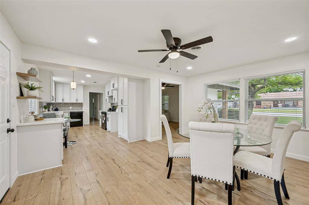 Beautifully updated, move-in ready home on a large lot with no HOA in the heart of North Richland Hills—offering modern updates, timeless charm, and a warm, welcoming feel. Such inviting curb appeal! This home features a freshly painted exterior, a spacious covered front porch with cedar accents, and recently installed energy-efficient windows that fill the home with natural light. Major system updates include a newer roof (2024), new water heater (2024), and updated PEX plumbing for added peace of mind. Inside, you'll find new luxury vinyl plank flooring, updated ceiling fans, and a comfortable, functional layout with both an eat-in kitchen and a separate dining room—perfect for everyday living or gathering with family and friends. The fully renovated kitchen offers new cabinetry, stainless steel appliances, quartz countertops, designer backsplash, and updated hardware, creating a space that is both stylish and practical. The primary suite provides a private retreat with an ensuite bath and walk-in shower, while the oversized hall bath features a double vanity for added convenience. Set on a large, park-like lot, the backyard offers plenty of space to relax, entertain, or enjoy the outdoors, complete with a storage building. An oversized two-car garage with an expansive storage closet adds even more functionality.