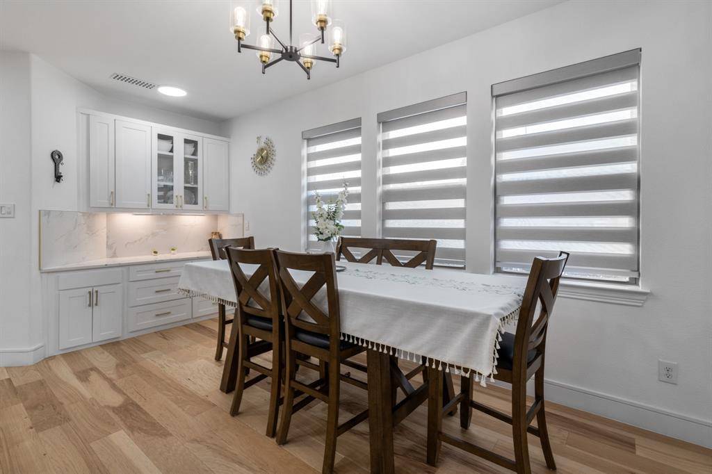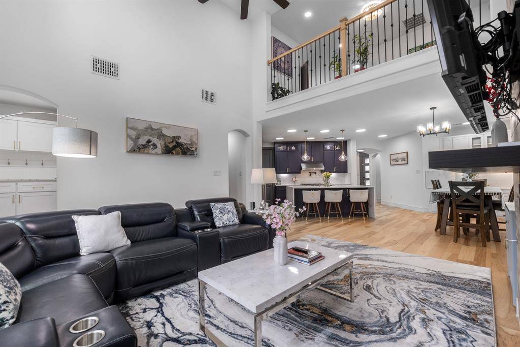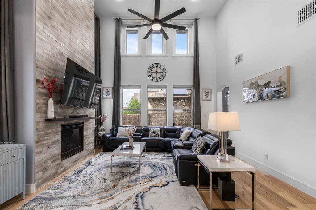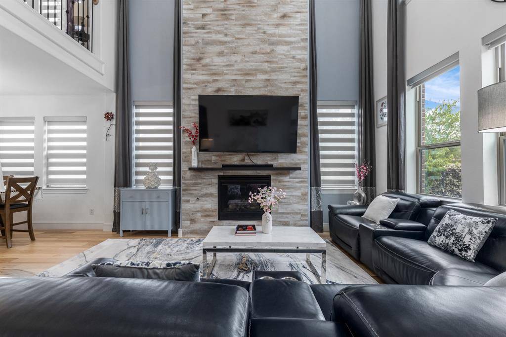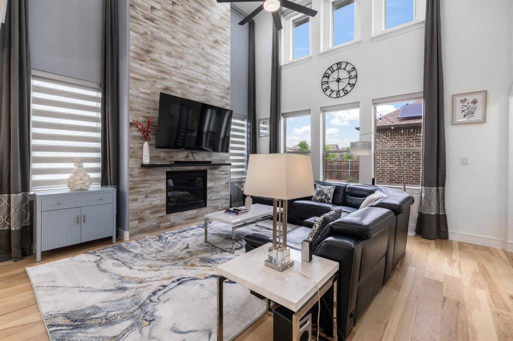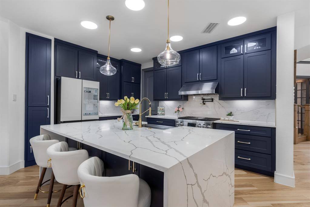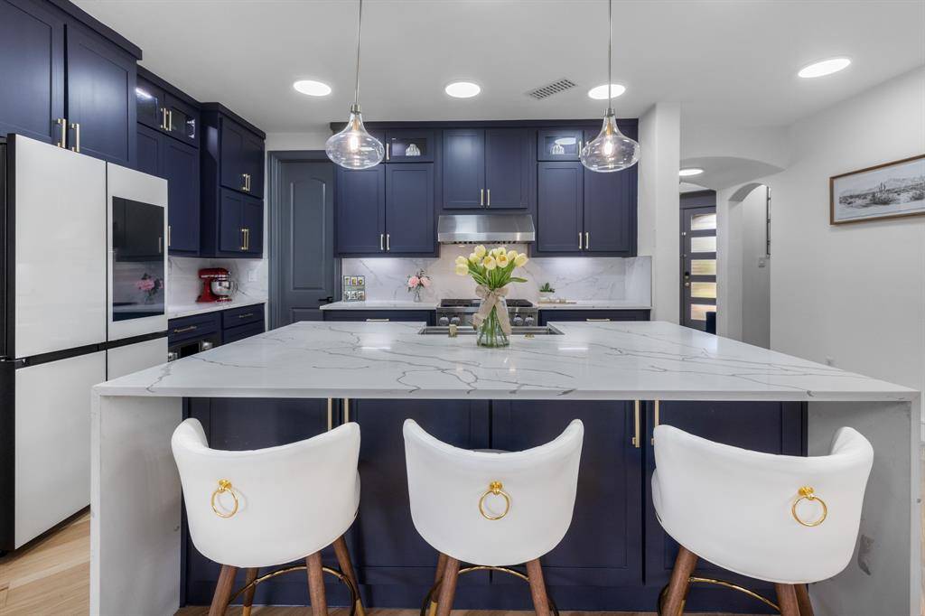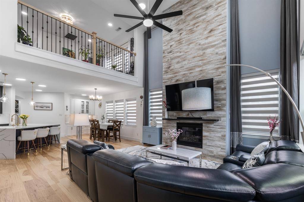 Designed for both everyday living and effortless entertaining, the light-filled open-concept living area showcases a dramatic floor-to-ceiling fireplace and seamless flow into a stunning chef's kitchen. Here, you'll find a statement quartz waterfall island, custom cabinetry, Signature collection stainless steel appliances with commercial grade range and vent hood, convection microwave -with built in air fryer- and oven, designer lighting, and a spacious walk-in pantry—equal parts beauty and function. The dining area has a dry bar with under cabinet lighting and extra storage, perfect for a coffee bar.