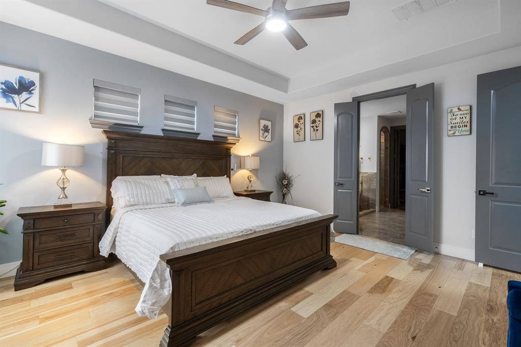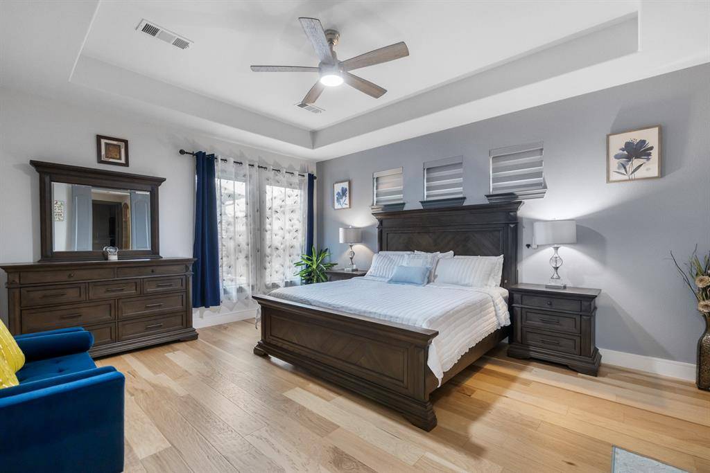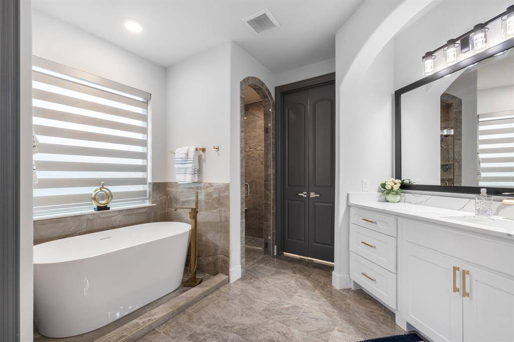 The expansive primary suite is a private retreat, featuring vaulted ceilings, abundant natural light, and a spa-inspired ensuite with a freestanding soaking tub, oversized shower, separate vanities, and walk in closet.