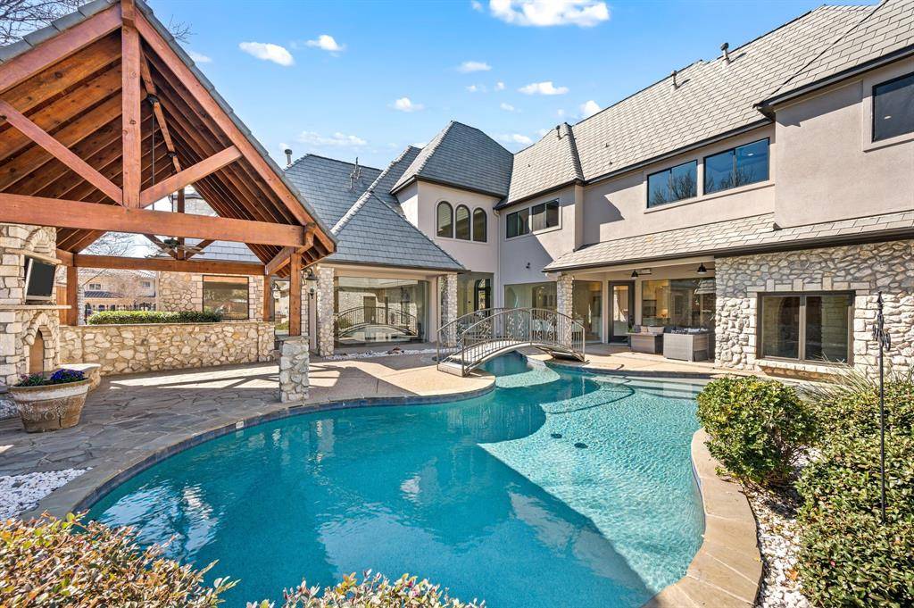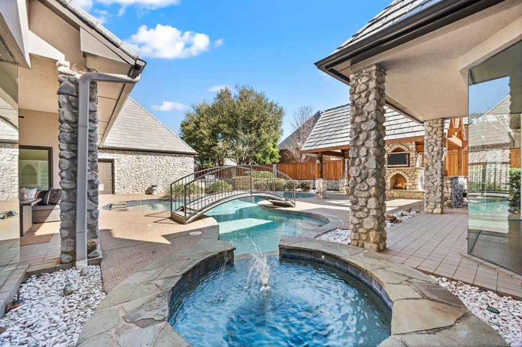 Welcome to this stunning, MOVE-IN READY luxury estate with 4 car garage situated on an exclusive half-acre corner lot in the prestigious 24-hour guard-gated community of Montclair Parc. Ideally located just minutes from Southlake Town Square, Downtown Historic Grapevine and DFW Airport this incredible home has it all! From the moment you enter the grand wrought-iron staircase, soaring vaulted ceilings and expansive windows create a breathtaking first impression, filling the home with natural light. Designed for elevated living and effortless entertaining, the first floor offers multiple living and dining spaces, an impressive media room, a walk-in wine room, dual butler's pantries and a spacious laundry room complete with built-ins and a pet shower. The chef's kitchen is a true showpiece, featuring gorgeous quartz countertops, a built-in refrigerator, chef-style gas cooktop and an oversized island. The private primary suite is thoughtfully located on the main level and showcases a wall of windows overlooking the sparkling pool, a cozy double-sided fireplace, and an expansive custom walk-in closet with built-in shelving and vanity. The spa-inspired primary bath includes a soaking tub, built-in desk and a luxurious oversized shower with multiple shower heads for a true retreat experience. Upstairs you will enjoy a spacious game room with wet bar, a dedicated office with custom built-ins, and a generously sized secondary primary suite, ideal for multigenerational living or extended guests. Step outside to your own private resort. The covered patio overlooks a spectacular pool with a swim-up bar, while a charming bridge leads to a covered entertaining space with a fireplace. A built-in grill completes the outdoor living experience, creating the perfect setting for unforgettable gatherings year-round. You don't want to miss your chance for luxury and resort-style living, all in one remarkable property.