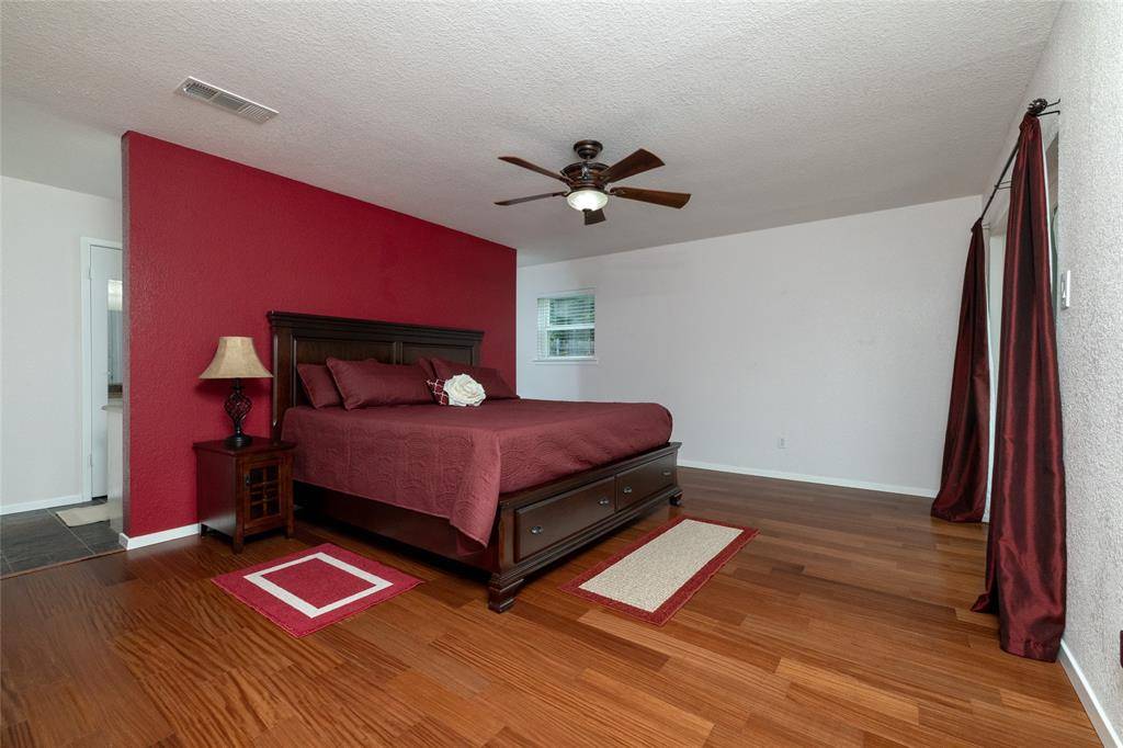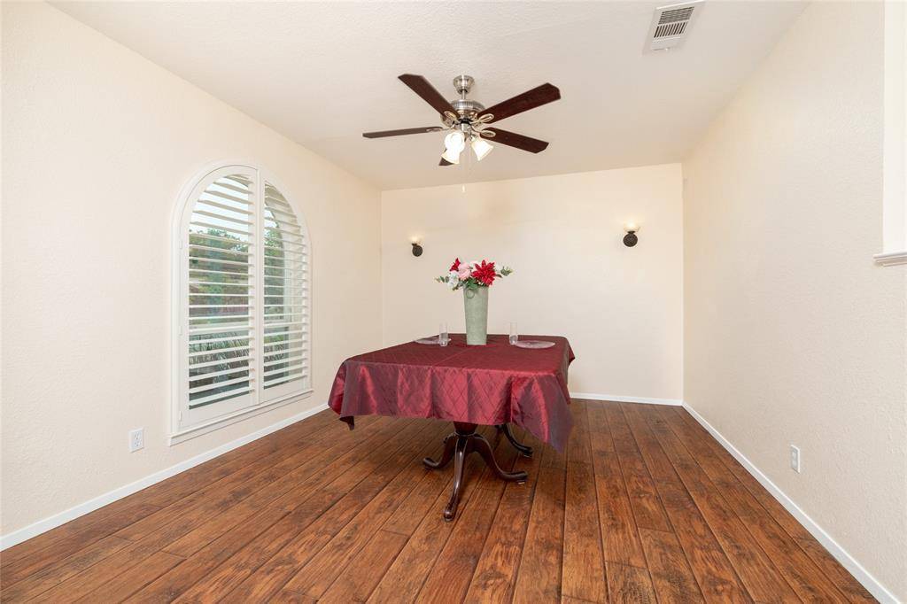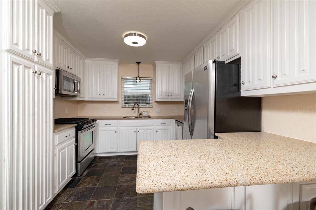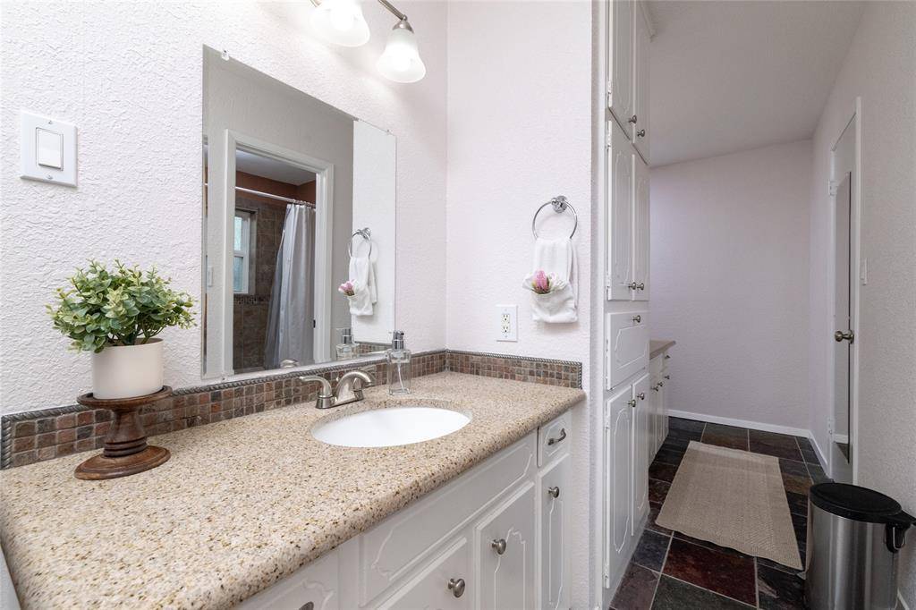 A Rare Gem nestled in a well established neighborhood. It offers 2 Primary Bedrooms plus 1 additional bedroom, 1 Living area, 1 eating nook plus a Dining area, gas cooktop, plantation shutters, breakfast bar, slate flooring in kitchen and eating nook, granite counters with tiled backsplash, wood laminate in 1st DA, ceramic tile in 2nd Primary and the 3rd bedroom. There are lots of updates throughout, a brick-walled Wood-burning fireplace, Marble entryway, and large backyard with 2 storage sheds. In addition to the 2 car garage there is Boat or RV parking. All appliances, White washer and Dryer with pedestals plus the Stainless steel refrigerator remain. Foundation warranty is transferable.
