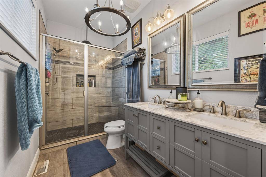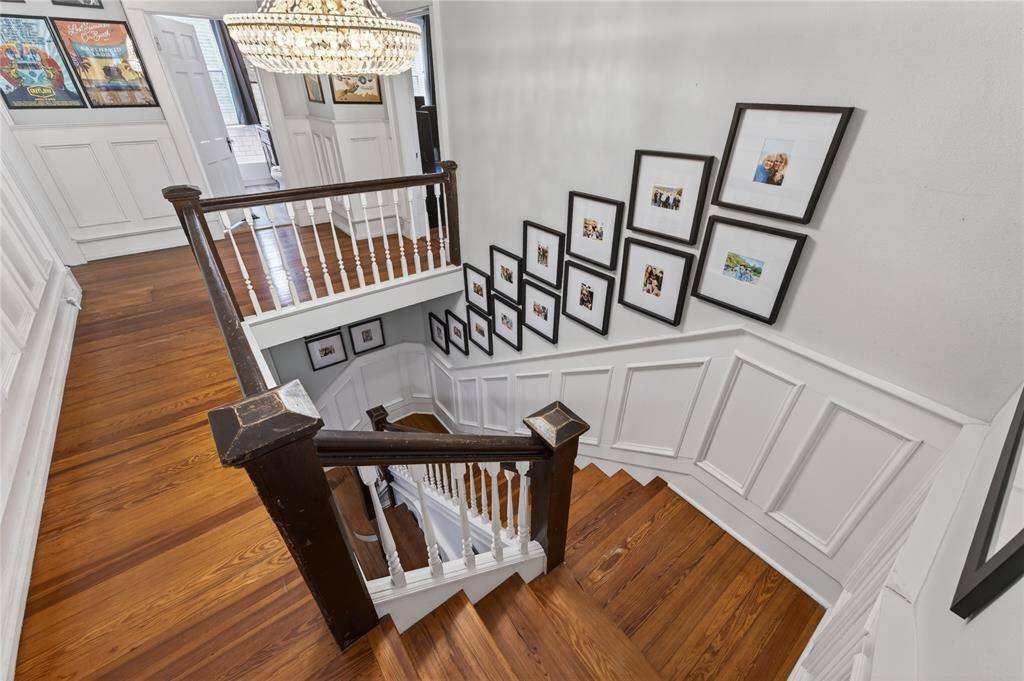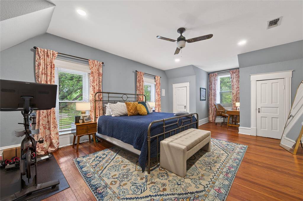 Classic 1914 architecture meets thoughtful updates on a .5389-acre corner lot with standout curb appeal, mature trees & layered native landscaping. The wraparound porch creates an inviting entry & extended outdoor living space, setting the tone for interiors rich with character—tall ceilings, original hardwood floors & abundant natural light throughout. The main level offers two distinct living areas, including a spacious front living room with fireplace detail & a relaxed secondary living space with adjacent half bath, ideal for flexible use. Two first-floor bedrooms sit side by side, with one currently configured as an expansive custom closet that flows directly into a fully remodeled full bath. A large dining area connects seamlessly to the updated kitchen, featuring stainless steel appliances, pantry storage, open shelving accents & clean finishes. Updated electrical & double pane windows & no carpet help bring this beauty up to modern standards while preserving its historic integrity.