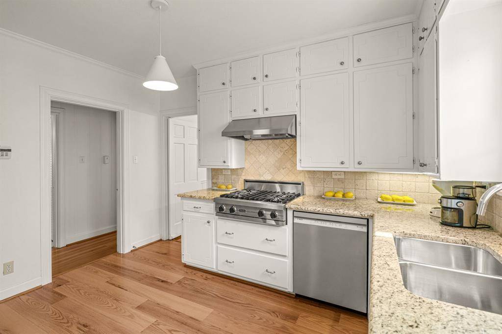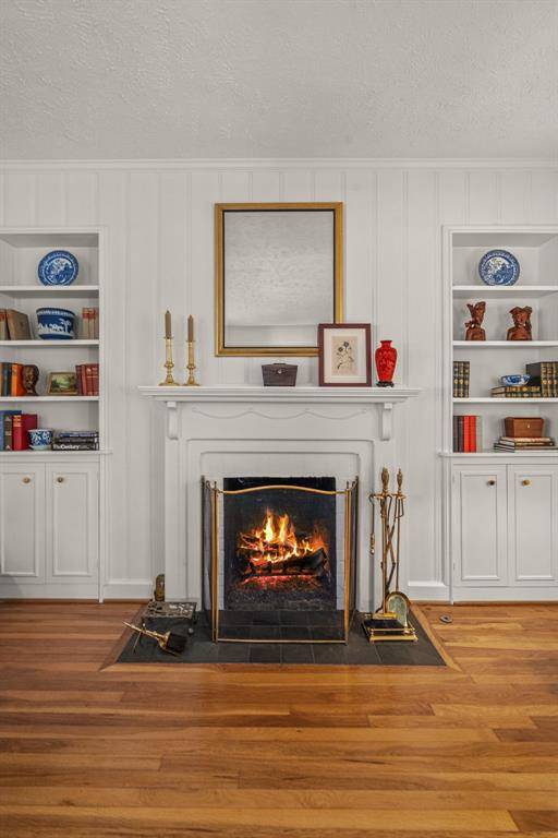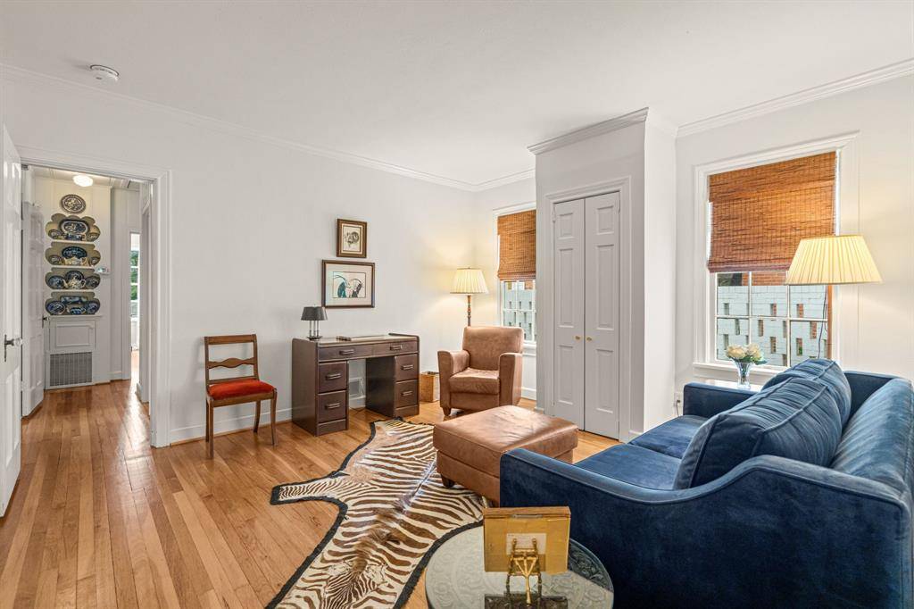 The living room is a true showcase of style with its stunning bay window and cozy fireplace that adds a touch of elegance. The decorative moldings and built-ins throughout provide both character and functionality.