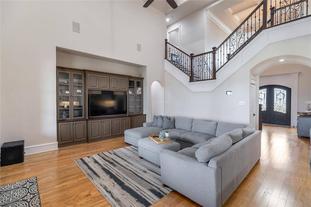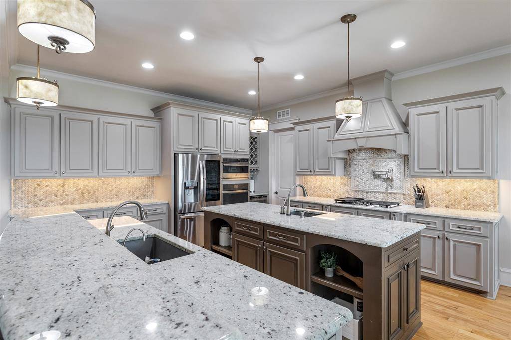 Introducing this exquisite 5-bedroom, 4.5-bath custom estate, privately situated on a sprawling 1-acre lot in the prestigious Willow Springs Ranch. Surrounded by lush, manicured landscaping, a gated drive through a Portica Shea welcomes you to a 3-car oversized garage. The grand interior showcases soaring ceilings and abundant natural light within an open-concept layout. The living room features custom built-ins and elegant French doors opening to the backyard patio, seamlessly blending indoor and outdoor living. The chef's kitchen is a standout with double islands, dual sinks, a 5-burner gas cooktop, vented exhaust fan, and an oversized walk-in butler's pantry, plus a beverage fridge and wine rack, breakfast bar seating, and abundant cabinetry—all flowing into the dining and living areas.