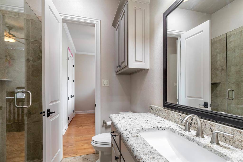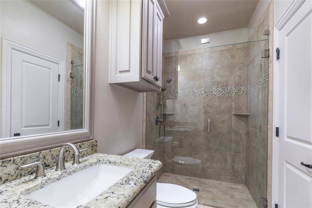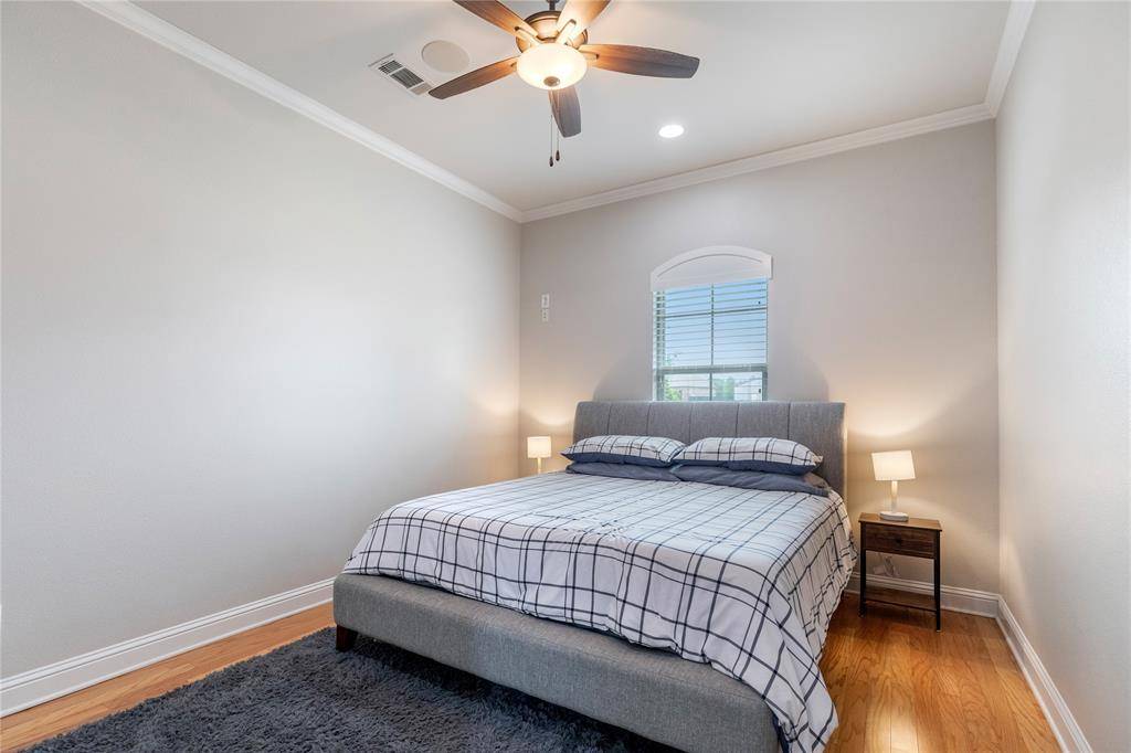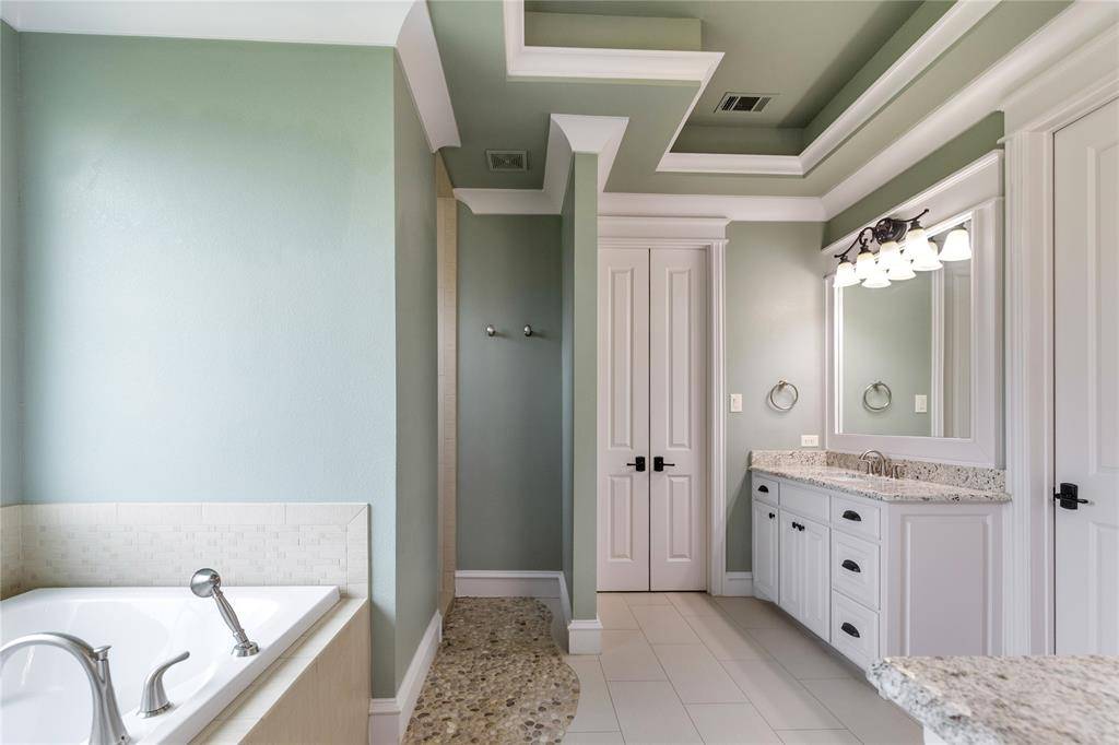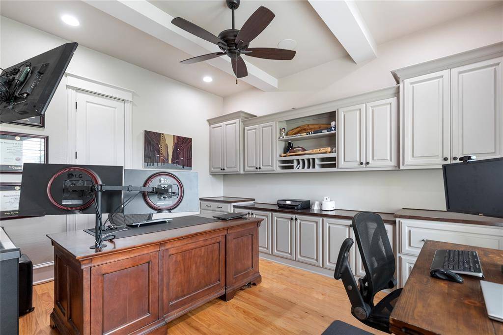 The private primary suite offers a refined retreat with serene backyard views and elegant French doors providing direct access to the patio. The spa-inspired ensuite includes dual vanities, a soaking jetted tub, separate shower, and an oversized walk-in closet. Secondary bedrooms are generously sized, with walk-in closets, with two extra bedrooms on the main level as well as a large private office with built-ins. The upstairs bedrooms feature private ensuite baths. Upstairs includes a game room and dedicated media room.